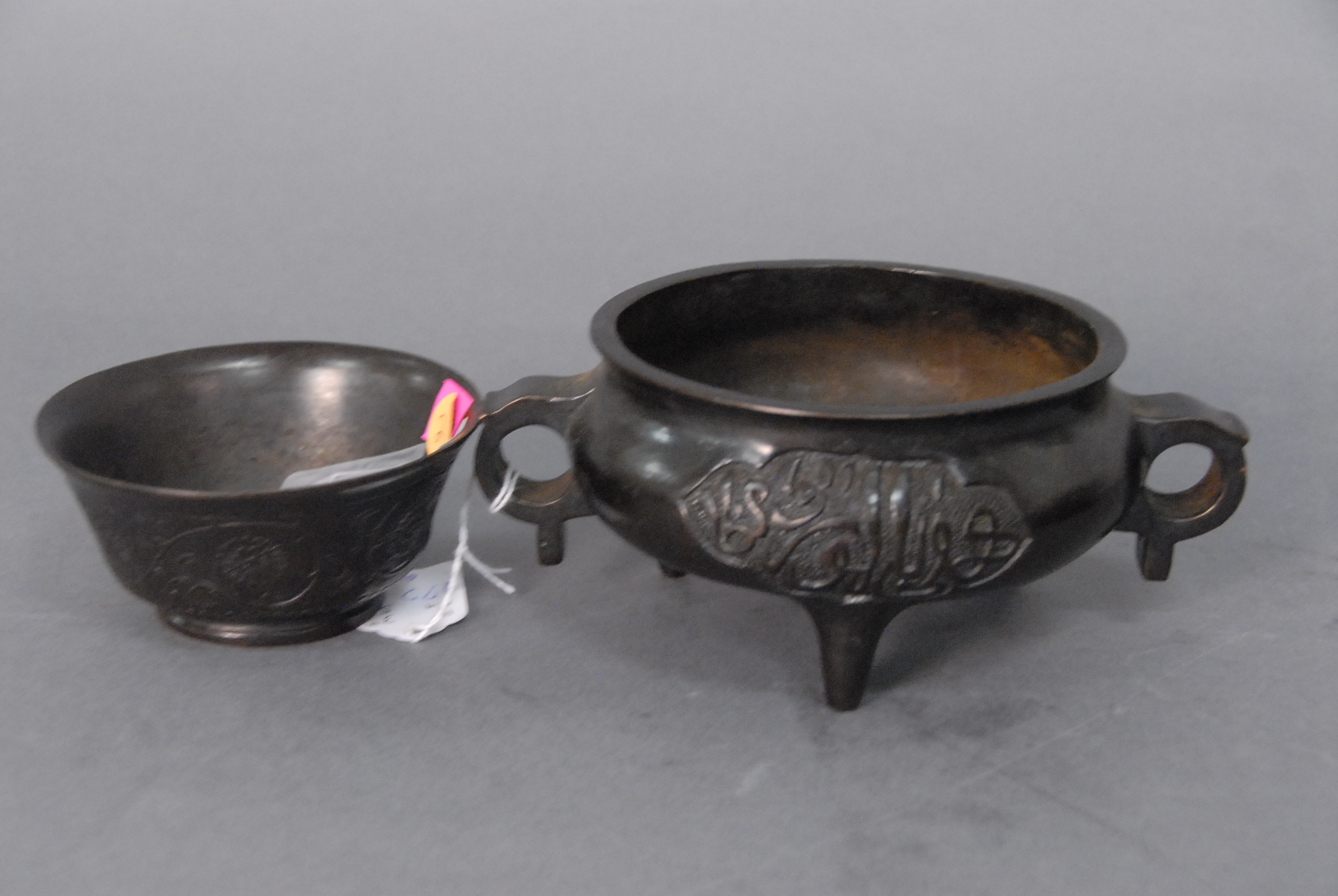 Two bronze incense burners one with scrolling flowers and four character mark on bottom dia. 4in. and the other having tripod base and molded handles with six character mark on bottom dia. 5in.