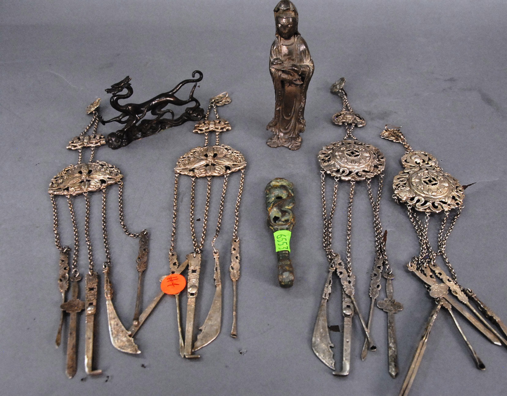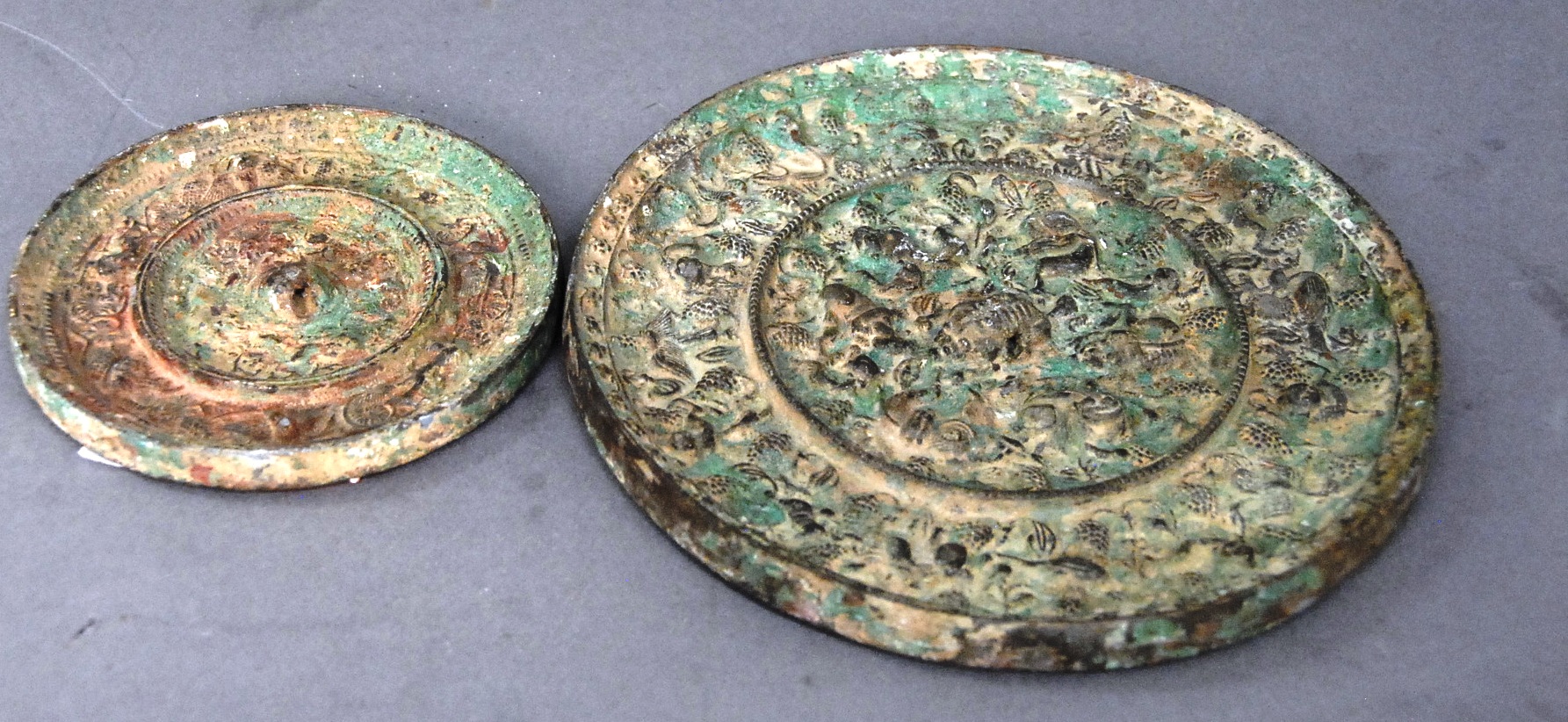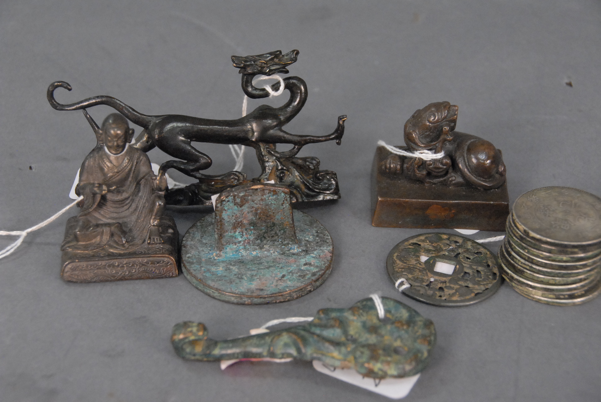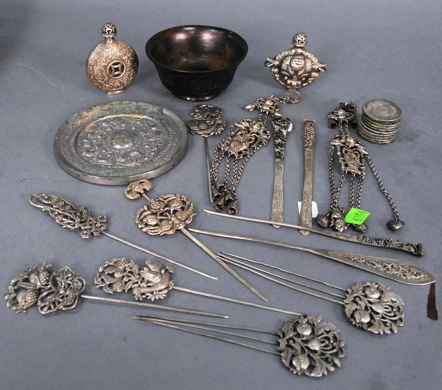 Large group of Oriental items to include two silver snuff bottles, ten silver coins, thirteen silver hair pieces, bronze mirror dia. 5in., and a bronze cup ht. 2in. dia. 4 1/4in.