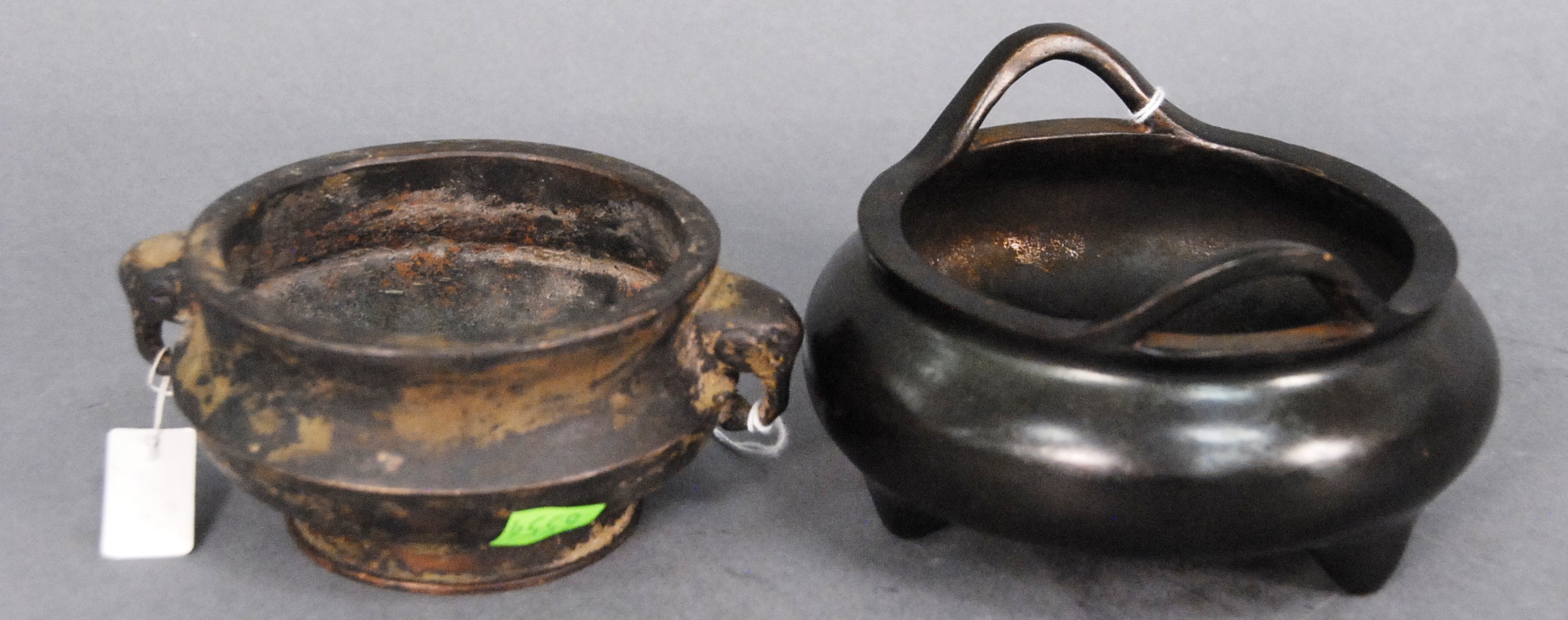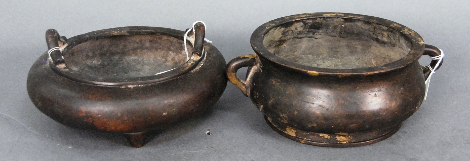 Two bronze censors one having three foot base with molded handles ht. 3 1/2in. dia. 7 1/2in. and the other with footed base and molded handles ht. 3 1/4in. dia. 6 1/2in.