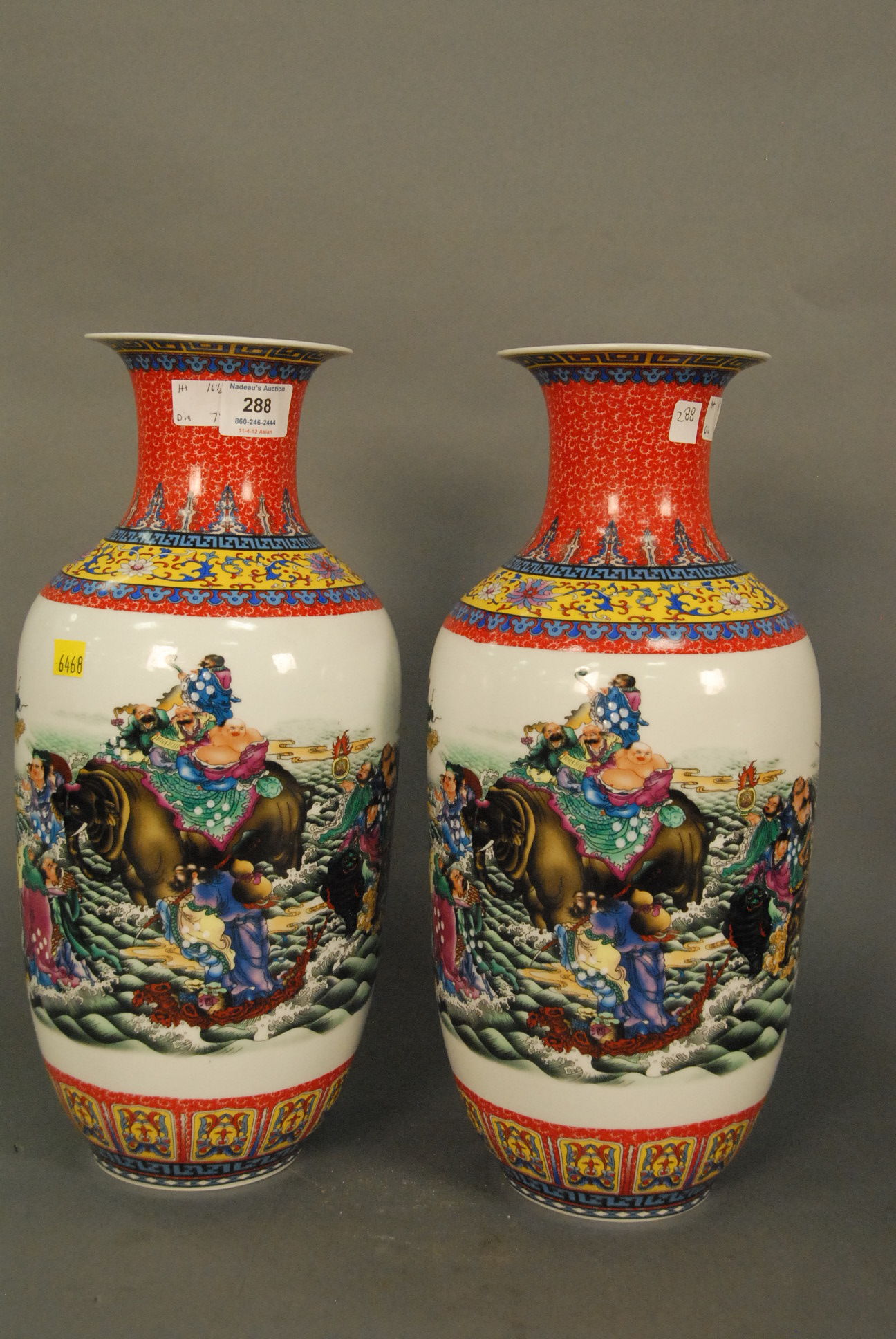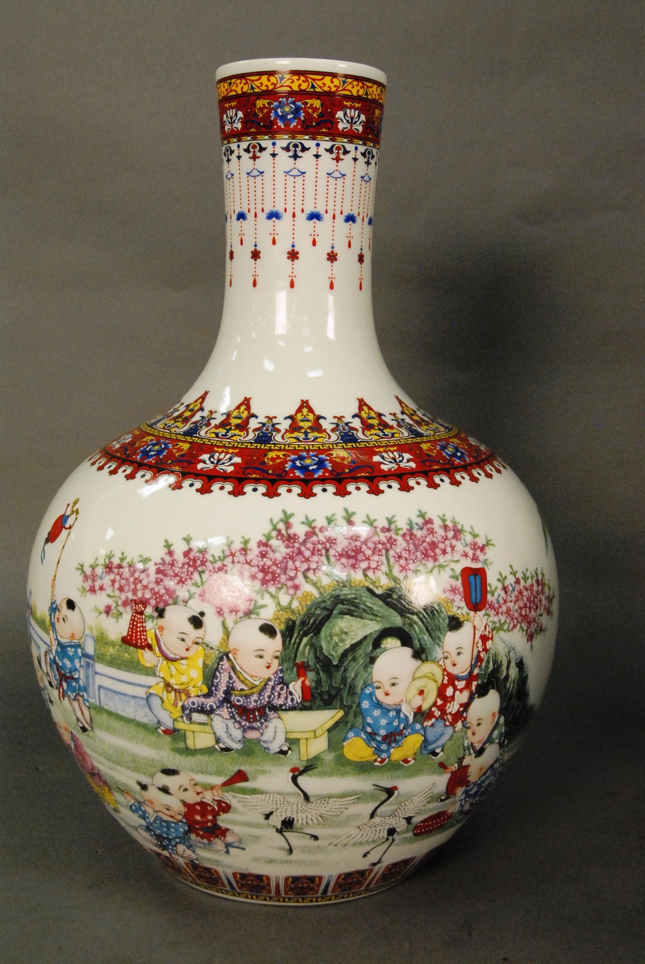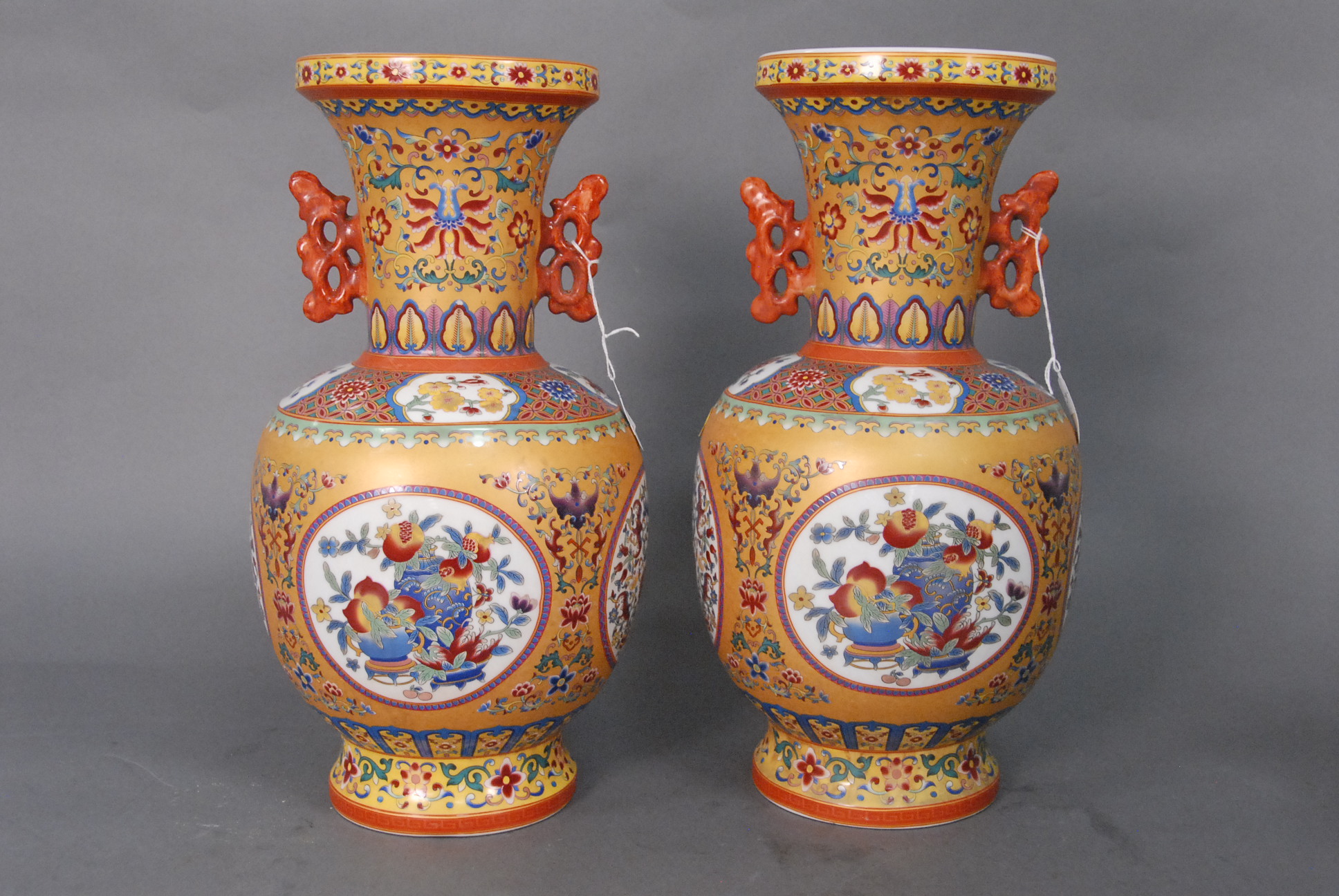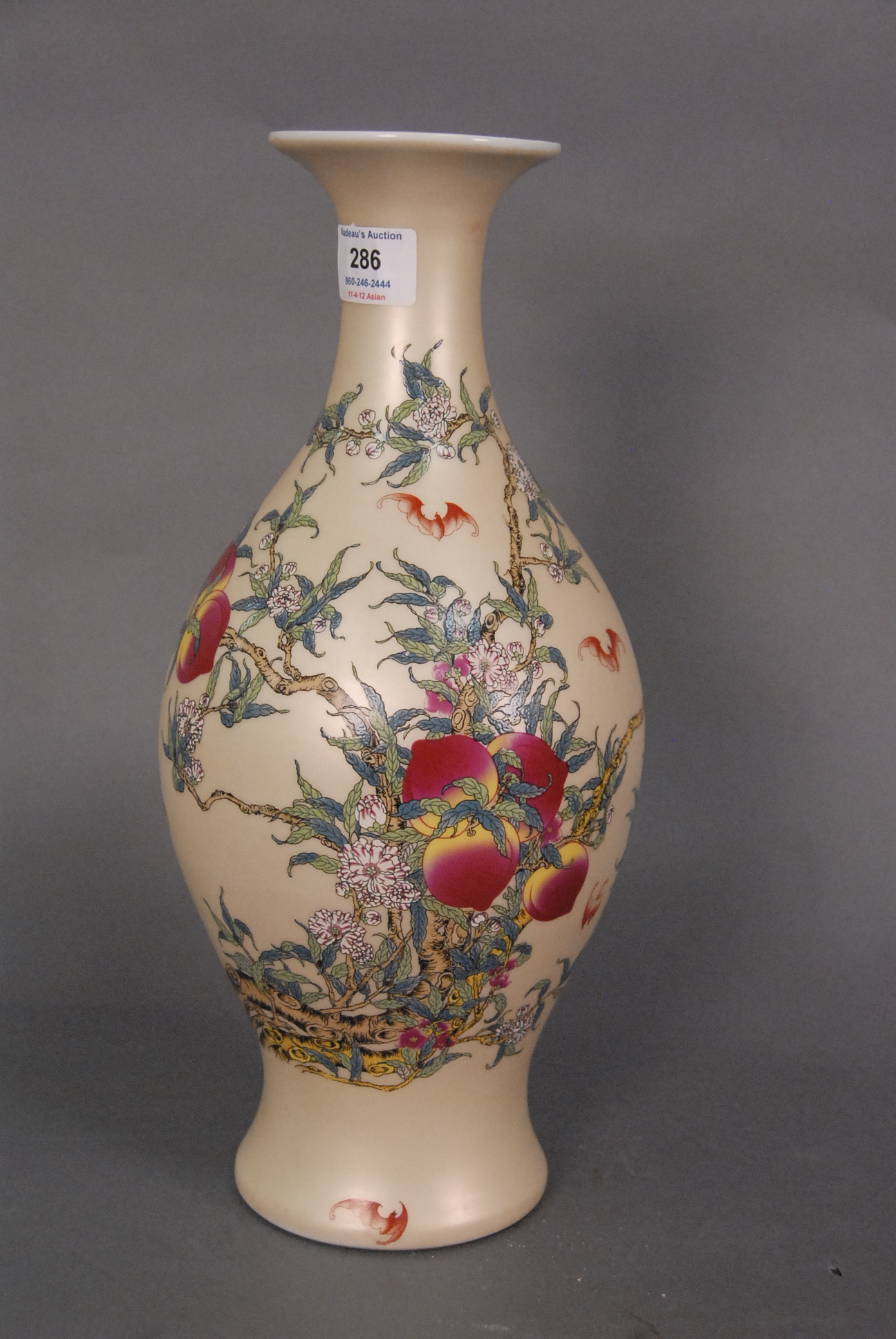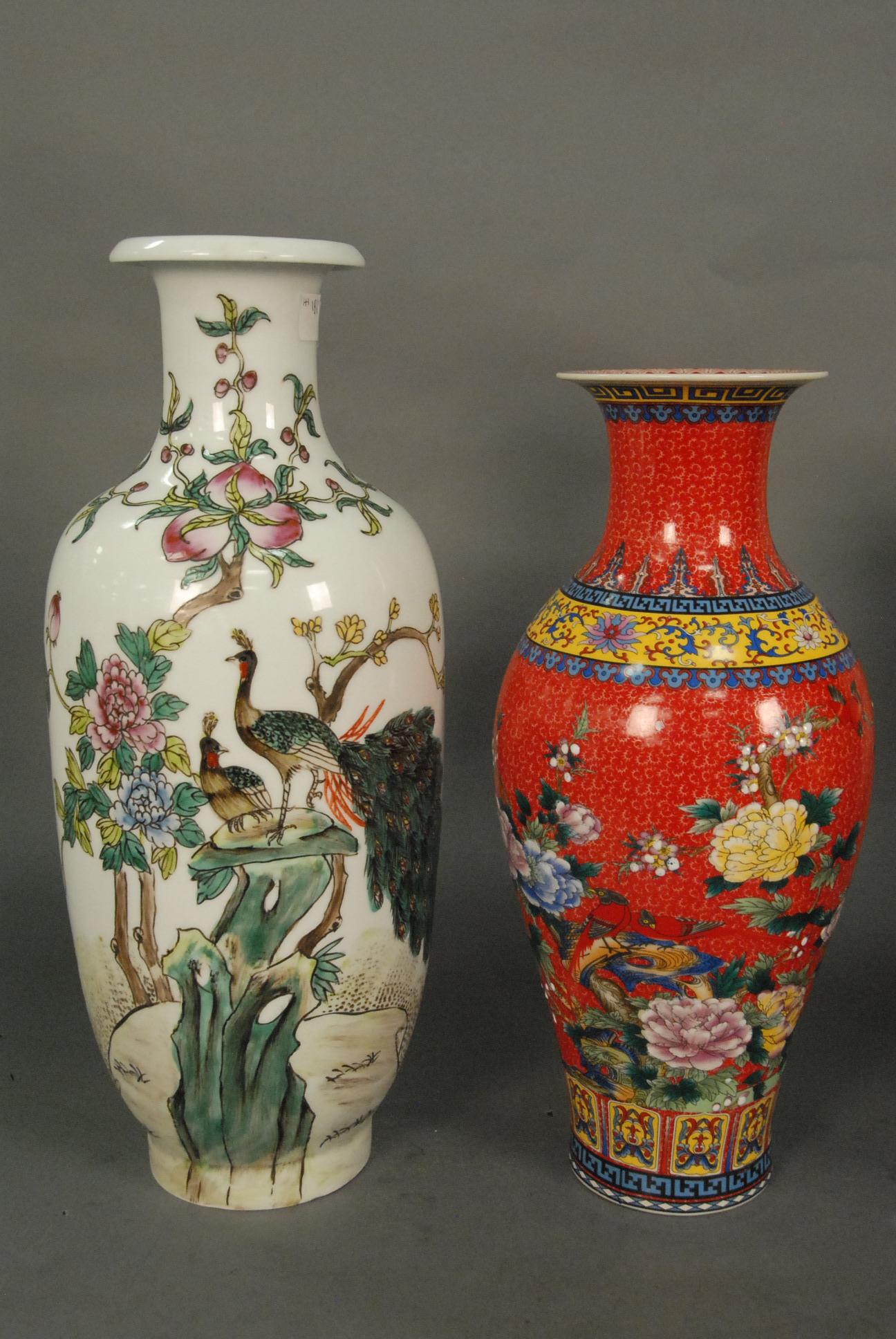 Two Oriental vases 20th century balluster vase with red ground having wild flowers and birds with six character mark on bottom ht. 16in. and Famille rose 20th century peacock vase with blue Qianlong mark on bottom ht. 18 1/2in.