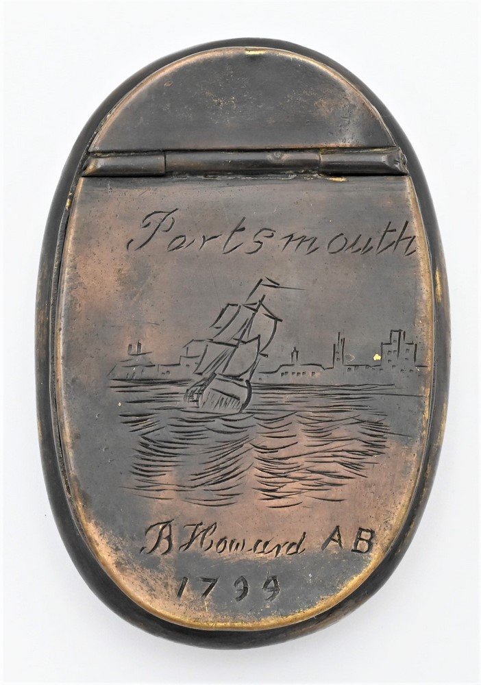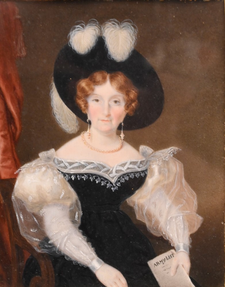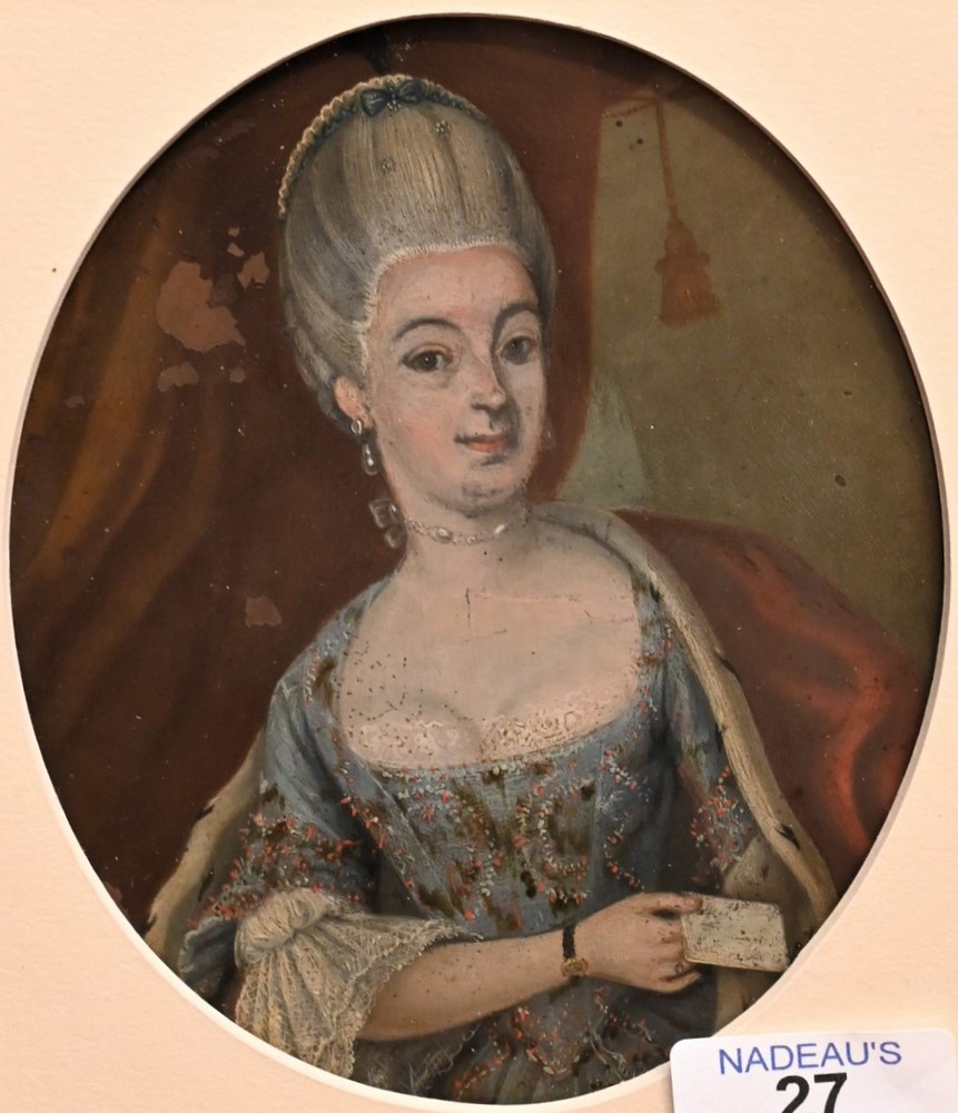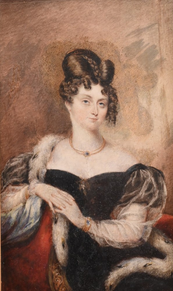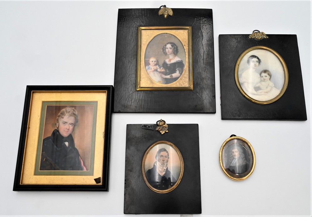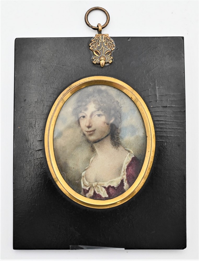 Two Miniature Portraits to include Josef Eduard Teltscher (1801 – 1837) portrait of a man with a cane having eagle top, signed Teltscher, 3 1/4 x 2 3/4 inches along with oval continental box having 14 karat gold hinged frame and portrait of a woman on the top, 1 1/2 x 1 inches