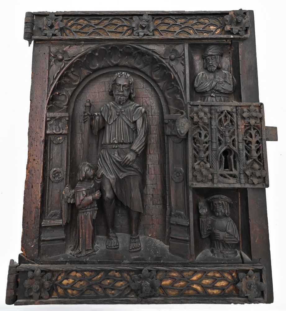 two busts to the right, pierced ironwork hinges and lock, sliding arm bolt