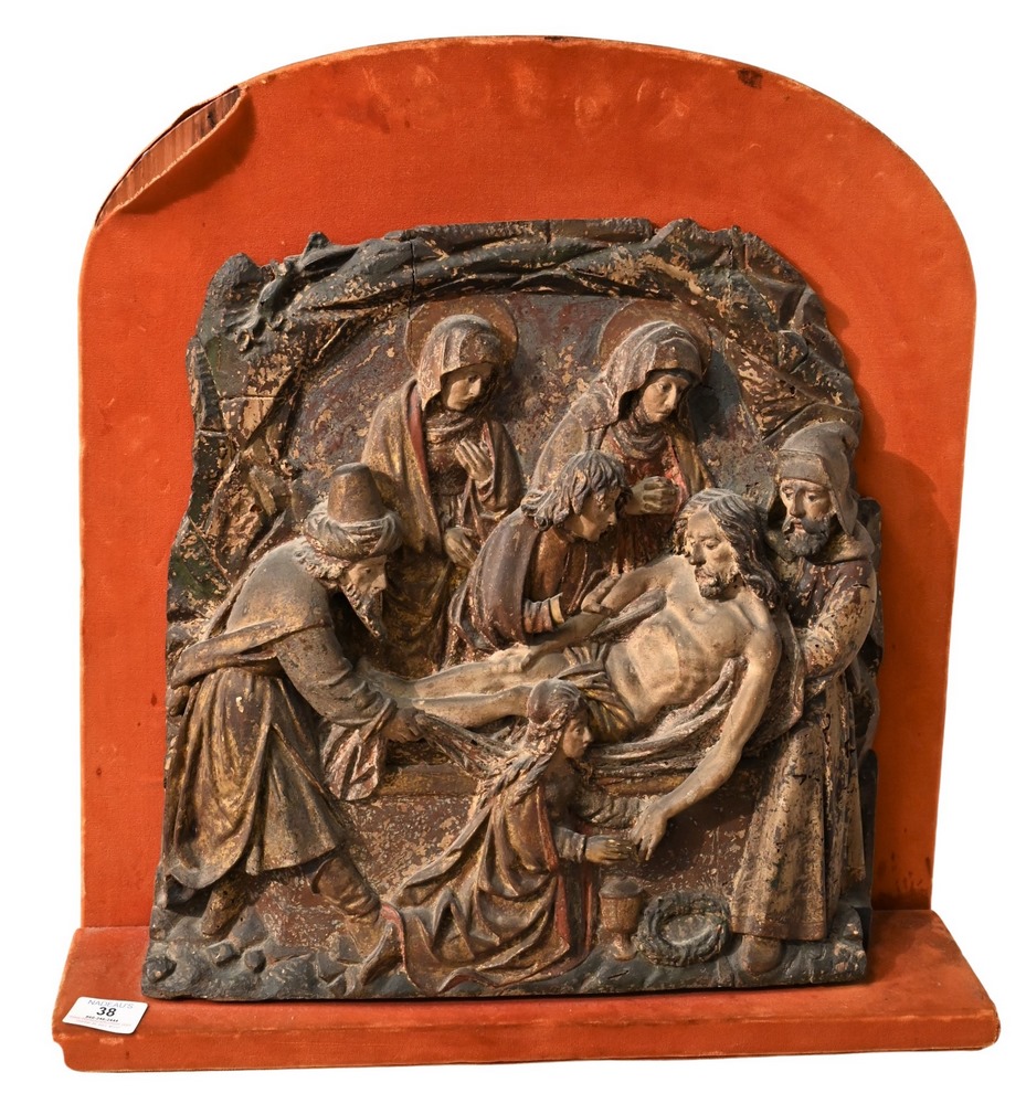 depicting our Saviour being lowered gently onto the burial couch Mary Magdalene anointing him in the foreground, His Mother and saints attending in the back