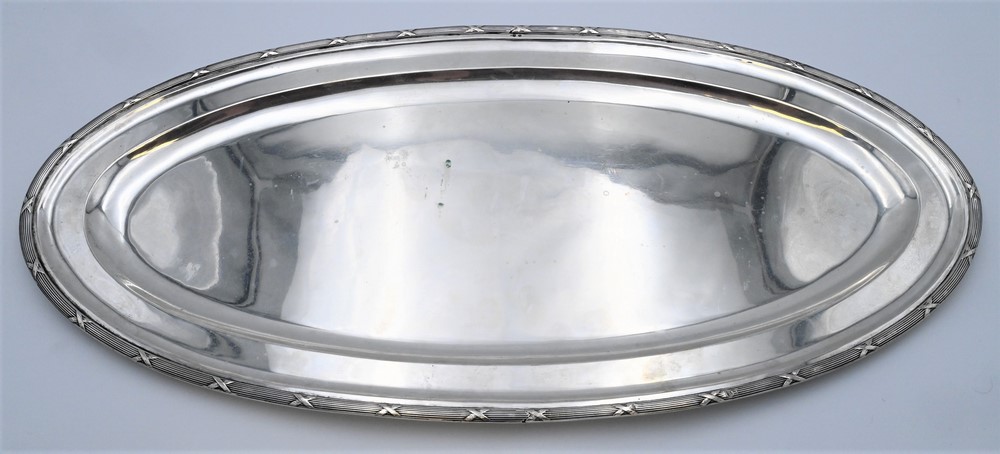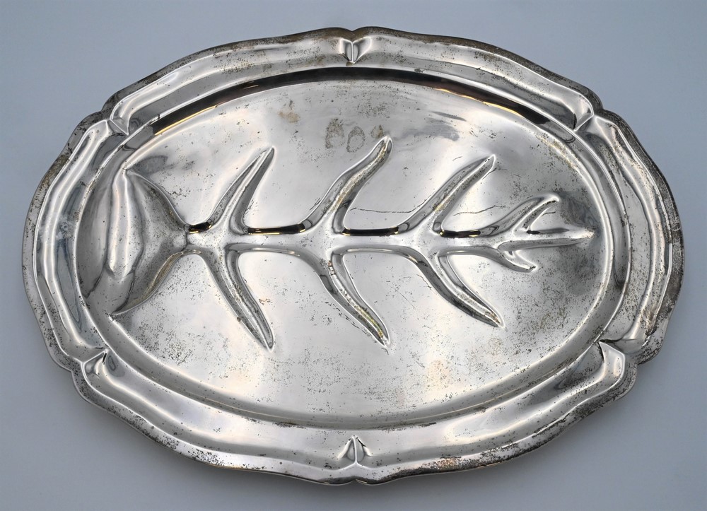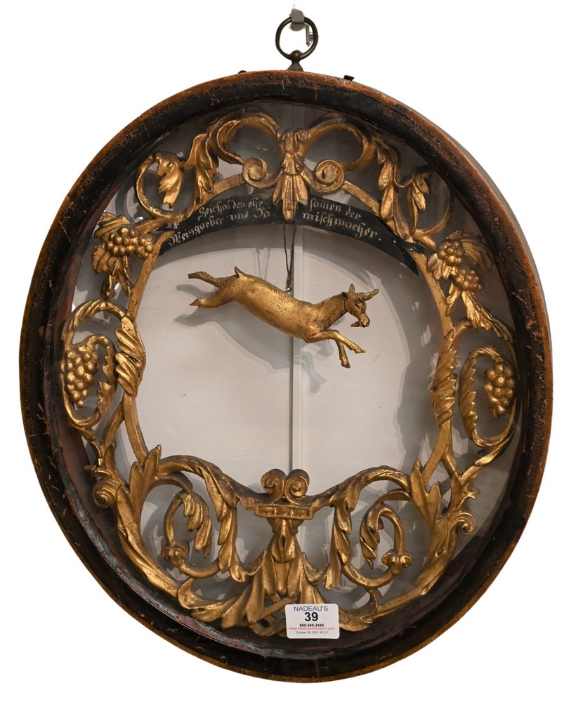 oval form with the interior composed of scrolls and fruiting vines and a leaping goat, beneath an inscription in German