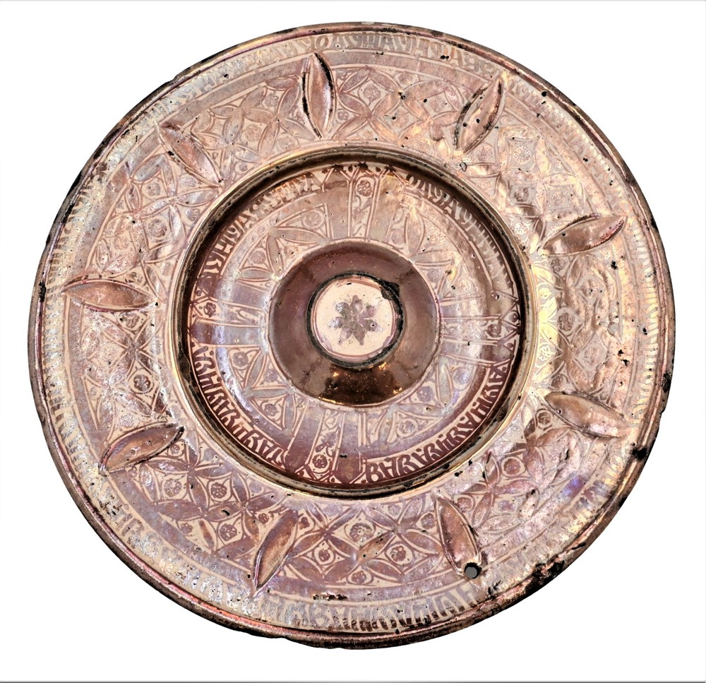 Hispano Moresque Lustreware Charger interior with a raised boss within Islamic script geometric designs draper pattern rim interrupted by nine lozenges decorated with continuous band of Islamic script late 16th century several chips, diameter 15 1/4 inches