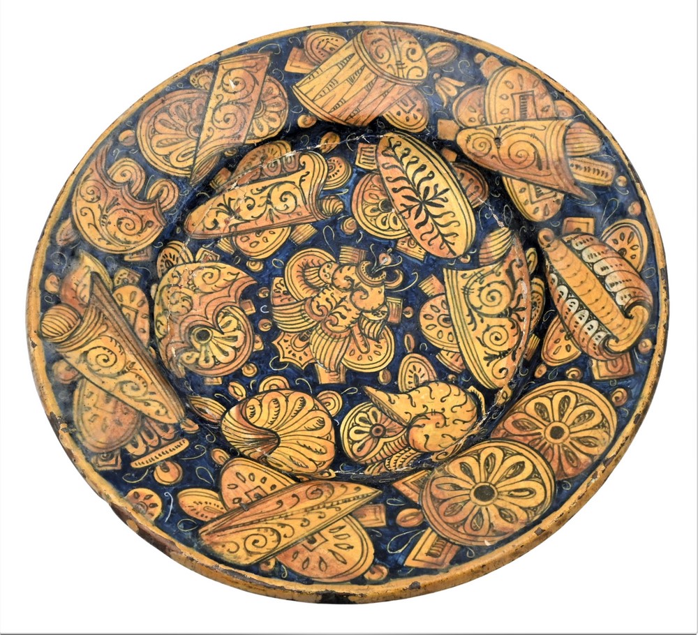 having wide circular sloping rim, cobalt blue ground decorated with ochre military motifs, including helmets, shields, armor, etc.