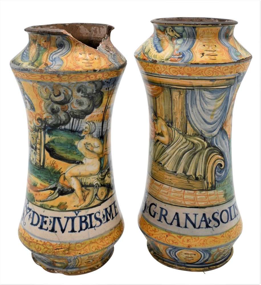 Pair of Majolica Polychrome Decorated Vessels Albarello and Castel Durante cylindrical form depicting figures and animals in a landscape one inscribed Grana Solis (worn) the other inscribed Sy De Jvivbis Me (large chip) height 12 1/2 inches
