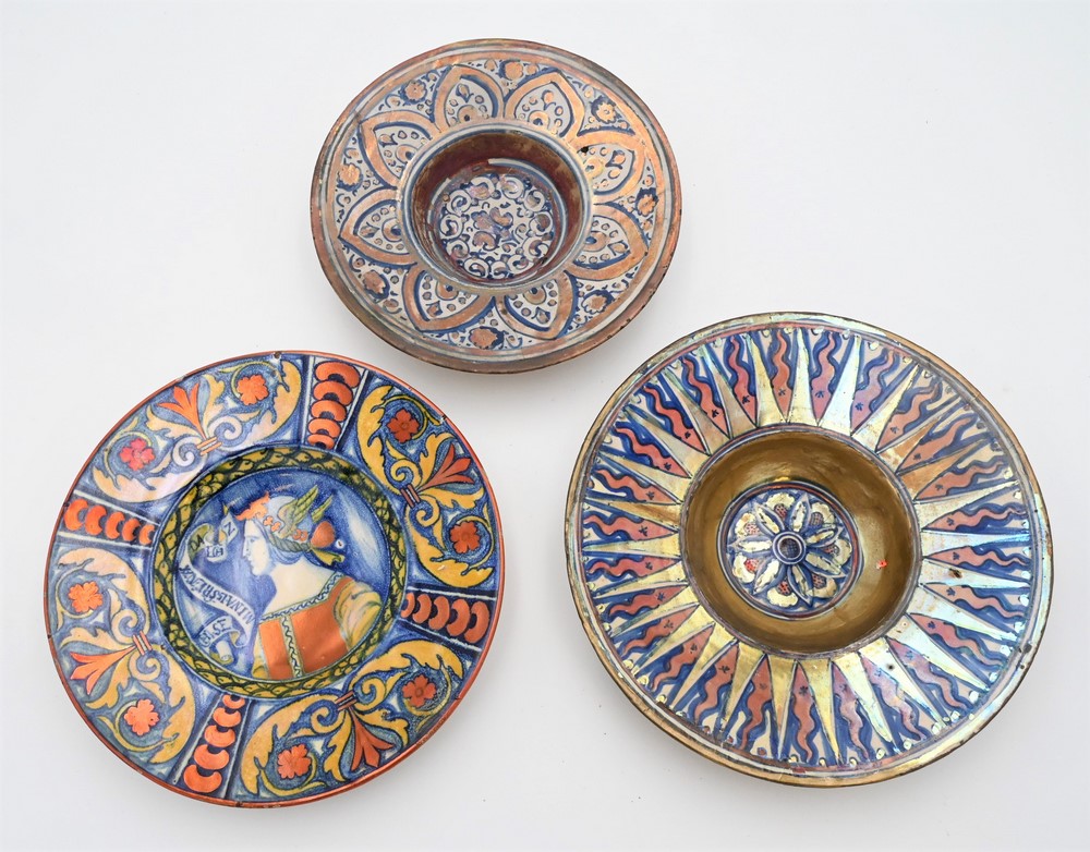Four Piece Polychrome Pottery Lot to include italian Majolica Tondo, probably Deruta, having gilt and painted flaming triangles stylizing sun design 16th century or later repaired a Deruta Majolica Tondino bowl having border decorated with petals in copper luster with cobalt blue 16th century or later repaired a Persian lustreware jug repaired along with a 19th century majolica portrait dish sun design diameter 9 3/4 inches, bowl diameter 8 1/4 inches, jug height 9 inches