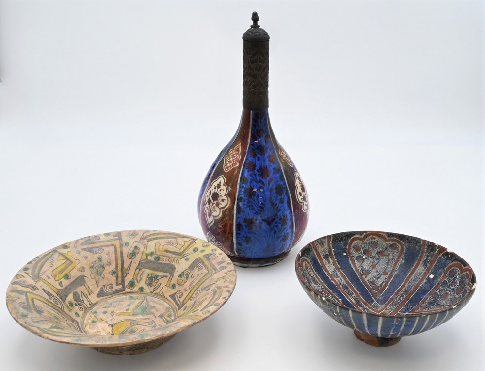 along with a persian lustreware jug, bulbous form with cylindrical neck, decorated with portraits and geometric forms