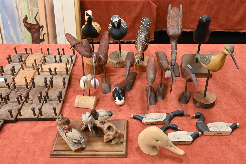Group of 19 Carved Decoys and Shore Birds to include a Lemuel Ward duck head; Harold Morse, 1967 Best in Show; 1942 one of a kind James Ahearn mini redheads; Boyds Collection Dudley; 2 H.V. Shourds; Robert Turk; 7 Shorebirds, signed; 2 Herb Cigar Daisey waterfield black crow