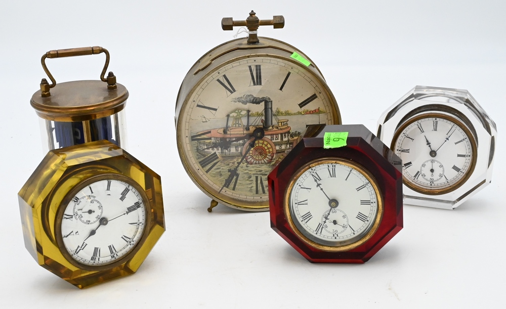 to include three E.N. Welch cut glass clocks having enameled dials; a Waterbury Clock Company animated alarm clock having painted steam ship with moving water wheel and pump; along with The Plato Clock,1903