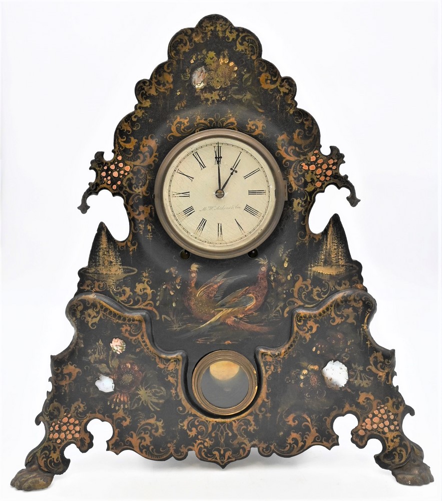 M.W. Atkins Iron Painted and Mother of Pearl Inlay Shelf Clock