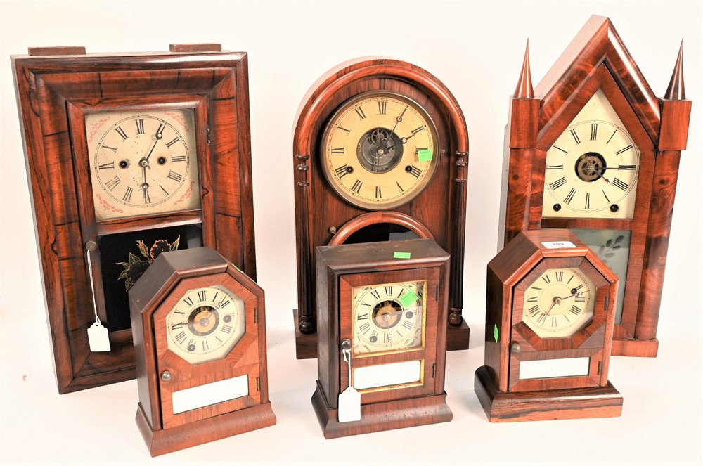 to include a Brewster & Ingraham mahogany steeple clock; Joseph Ives beehive 8-day clock; three small Seth Thomas shelf clocks, one with rosewood case; along with The Terry Clock one and eight day time pieces and striking