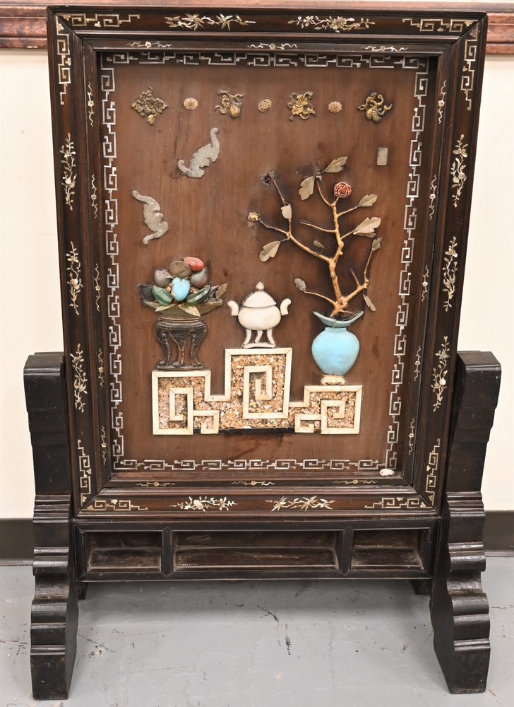 having mother of pearl inlaid frame of bats, antiques and scroll leaves with fruit, central screen mounted stone, bats, vases with fruit and flowers