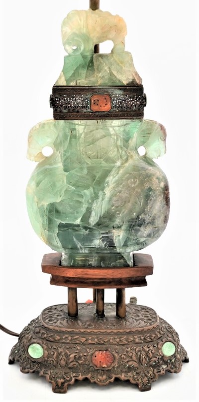 having carved animals, made into a table lamp on bronze base mounted with stones