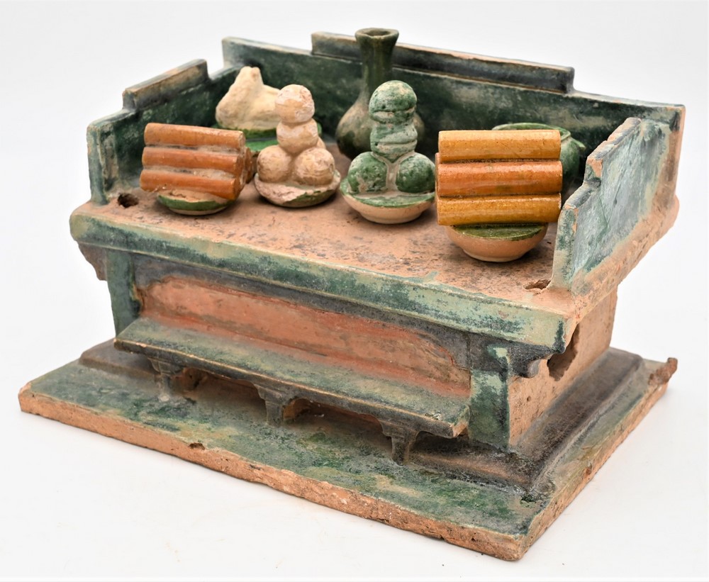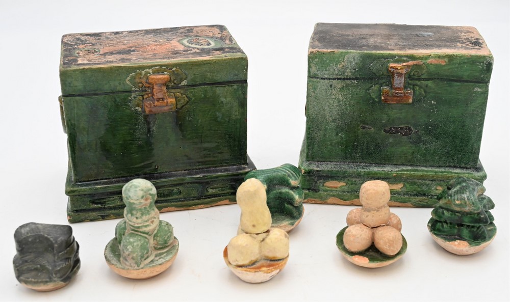 each green glazed pottery, tomb style chest having three funerary food offerings