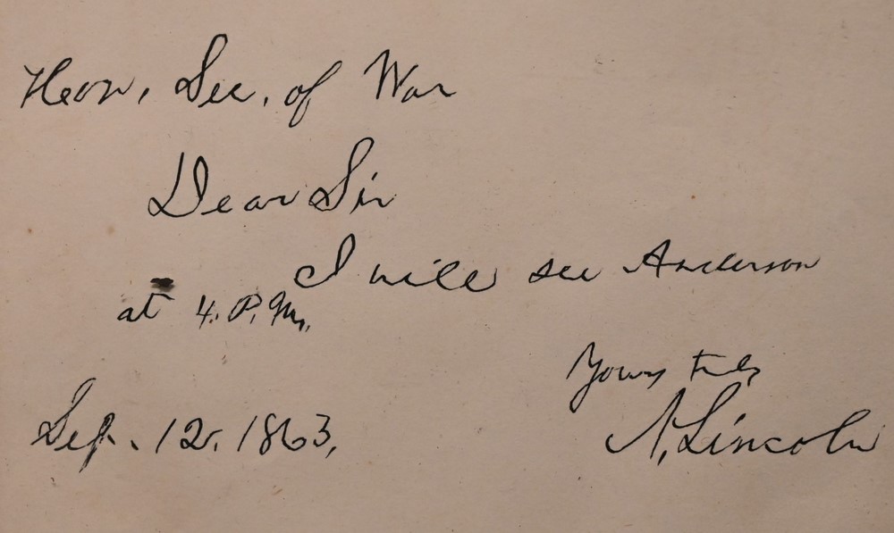 President Abraham Lincoln Signed Written Letter to Secretary of War dated September 12, 1863 letter reads “Hon. Secretary of War, Dear Sir….I will see Anderson at 4PM…yours truly, A.Lincoln”