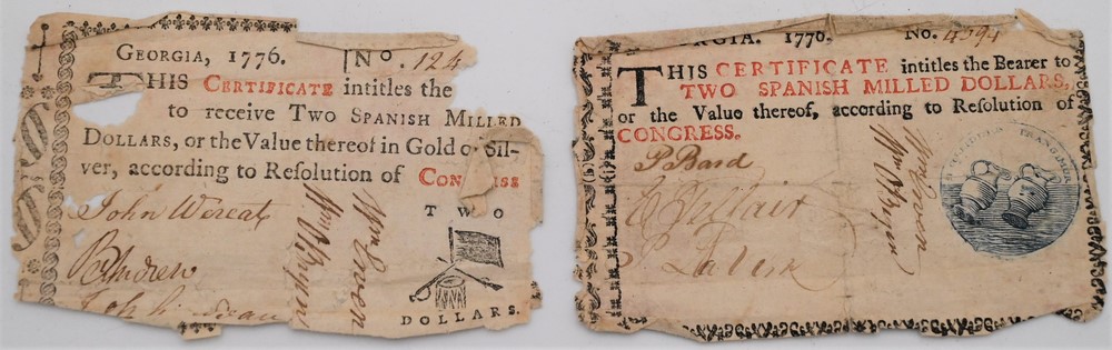 Two Georgia Colonial Paper Currency Notes or Banknotes 1776 marked “This certificate intitles the bearer to two Spanish milled dollars or the value thereof, according to Revolution of Congress” having light blue seal with floating jugs and the other “There of gold or silver” having seal with a drum sword gun and flag