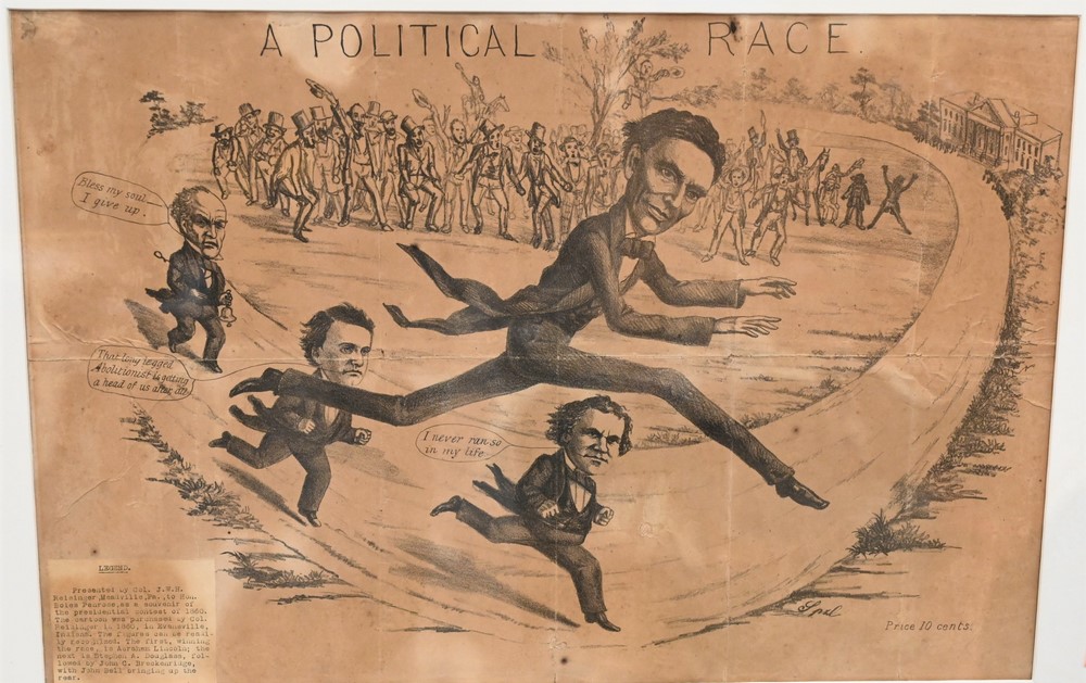 showing Abraham Lincoln beating John Bell, John Breckinridge and Stephen Douglas in a foot race