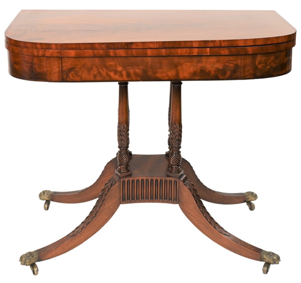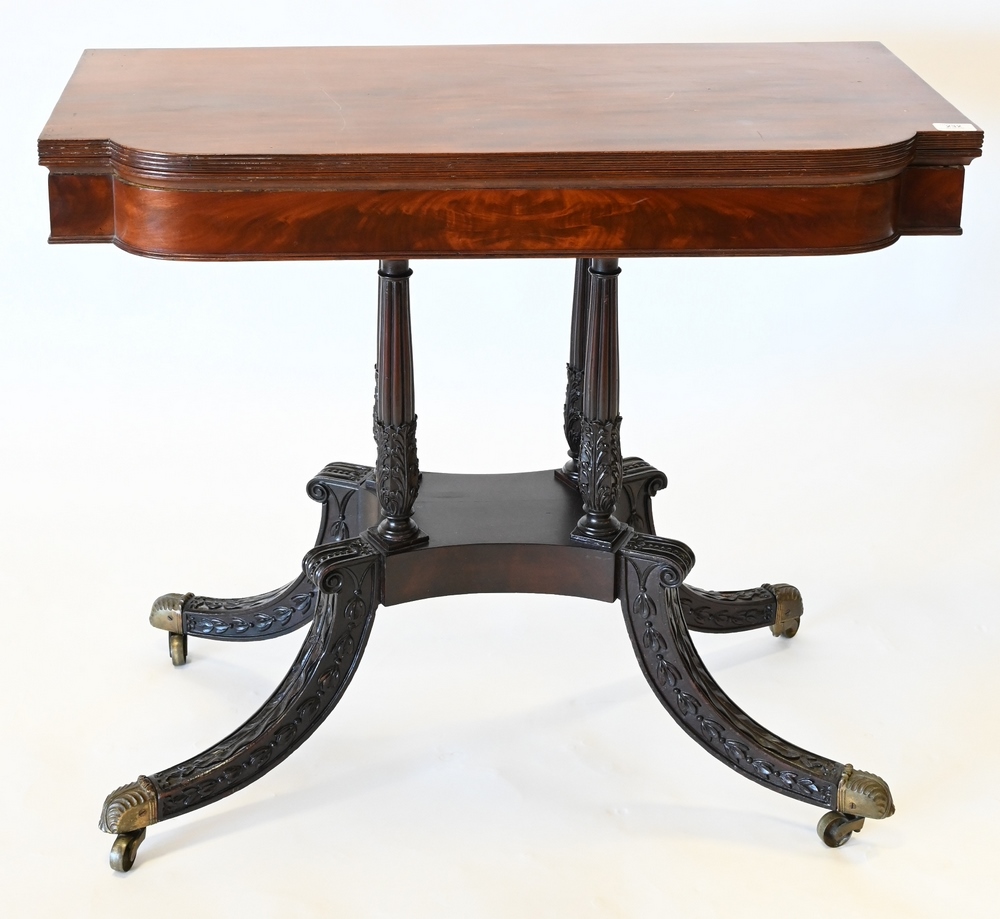 Federal Mahogany Game Table on carved and fluted supports set on four carved downswept members circa 1820 height 29 3/4 inches, top 17 3/4 x 36 inches Provenance: Estate of James Dana English of New Haven to benefit the New Haven Museum.