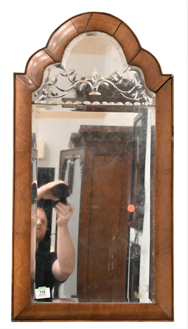Queen Anne Two Part Mirror, having etched floral design in top tablet, height 33 inches, width 17 inches. Provenance: Estate of Peter Tillou, Litchfield, Connecticut.