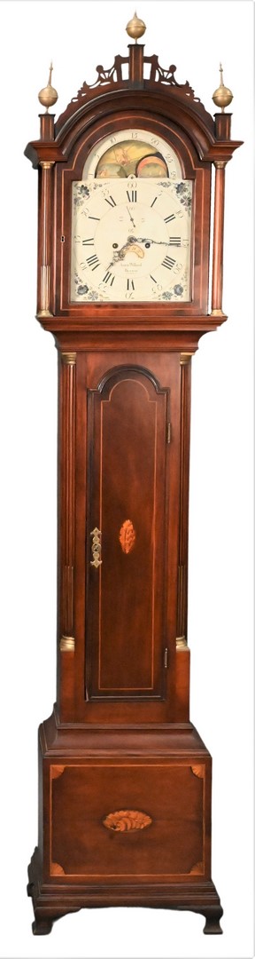 Hugh Roberts Mahogany Tall Clock, having moon phase dial and calendar, England or Scotland, height 87 inches. Provenance: Nadeau’s Auction Gallery, 1/1/2017, lot 368.