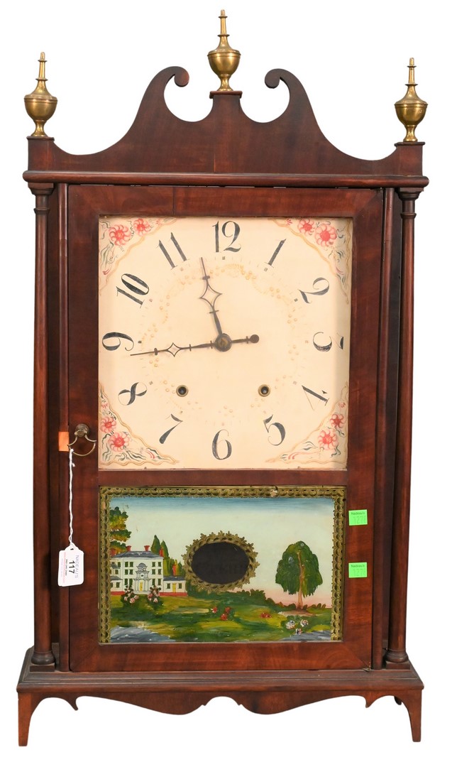 Birge Mallory & Company Shelf Clock, triple decker, having basket of fruit top, two eglomise panels, 30 hour movement, (chip in top leaf), height 35 3/4 inches. Provenance: Estate of Peter Tillou, Litchfield, Connecticut.