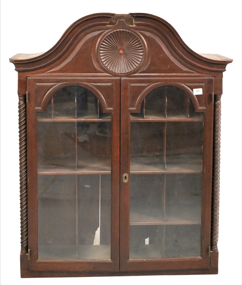 Mahogany Secretary Desk, top section only, having large round sunburst carving over two doors flanked by spiral columns, height 45 inches, width 34 1/8 inches, depth 10 3/4 inches. Provenance: Estate of Peter Tillou, Litchfield, Connecticut.