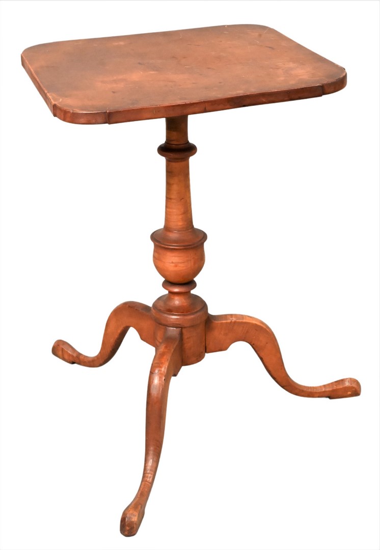 Federal Tiger Maple Candlestand, on shaped square top, on urn turned shaft, ending in tripod base, height 25 1/2 inches, top 16 3/4″ x 17″. Provenance: Estate of Peter Tillou, Litchfield, Connecticut.