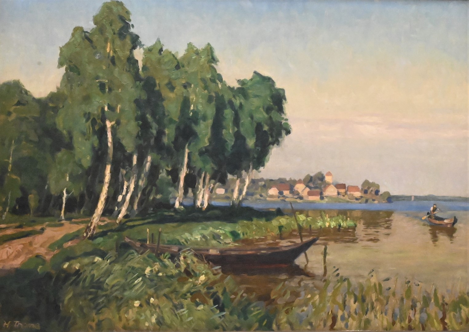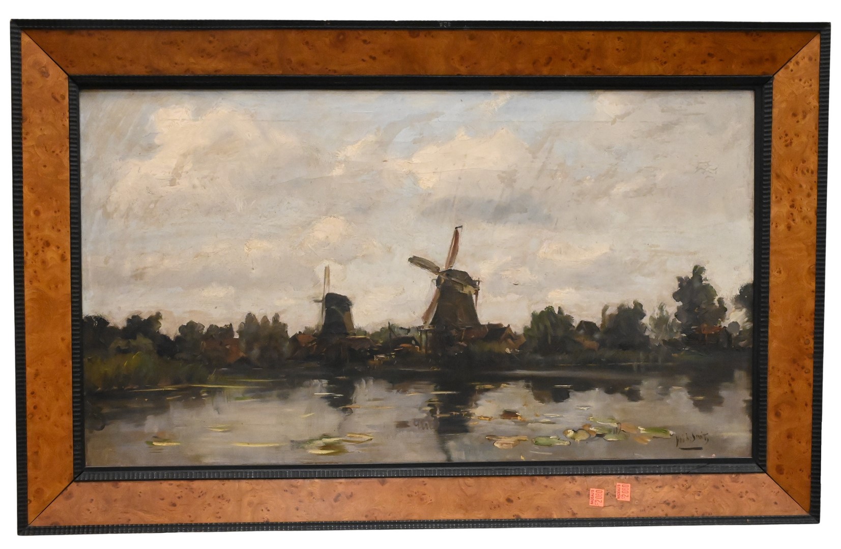 Hobbe Smith (1862 – 1942), oil on canvas, landscape, windmills along the river, signed lower right “Hobbe Smith”, remnants of original artist paper label on back, in burl frame, 18″ x 32″.