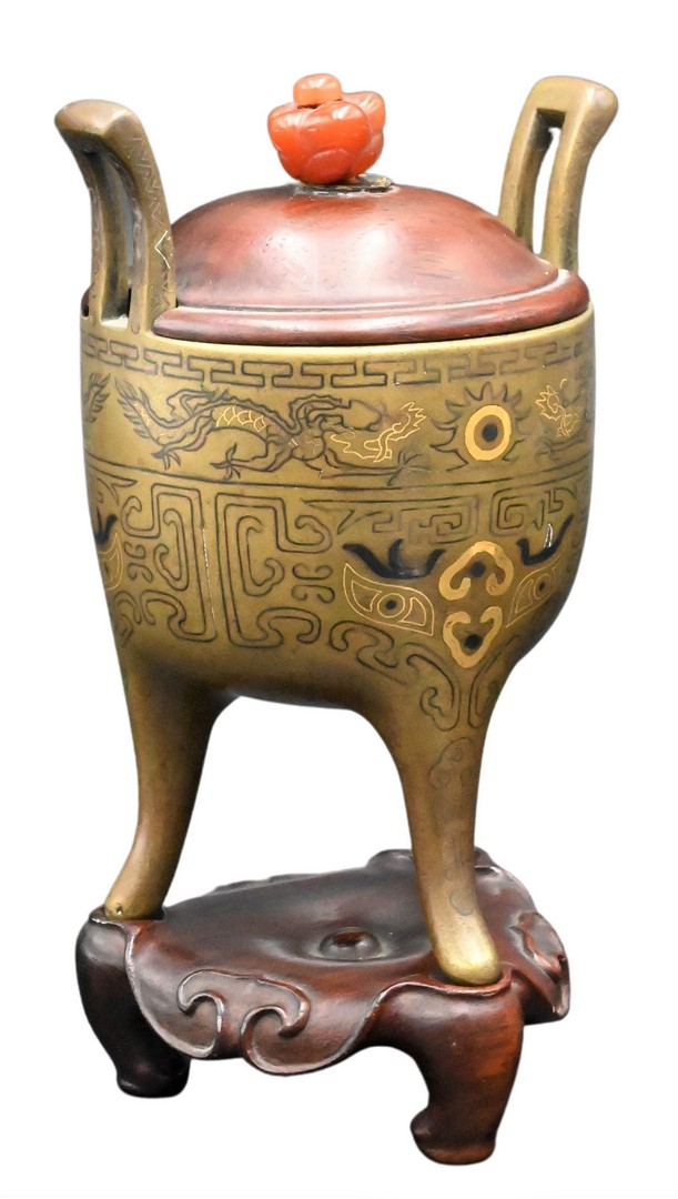 Famille Verte Porcelain Fang Ding, China, Kangxi 18th century or later, four-legged vessel in the shape of classic archaic bronze, characteristically decorated with central cartouche of yellow and aubergine flowers surrounded by green diamond-shaped border, inside four-character spurious but reverential mark on base reading “ta Ming nien chih” (made in the reign of Ming), with custom open-work wooden top and carved fungus finial, height 5 3/4 inches, length 6 1/2 inches, Provenance: From Collection in Irvington, New York.