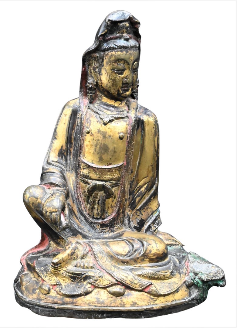 Bronze and Gilt Bronze Buddha Seated Figure, 19th century or earlier, (pot front near left hand missing), height 8 inches, Provenance: From Collection in Irvington, New York.