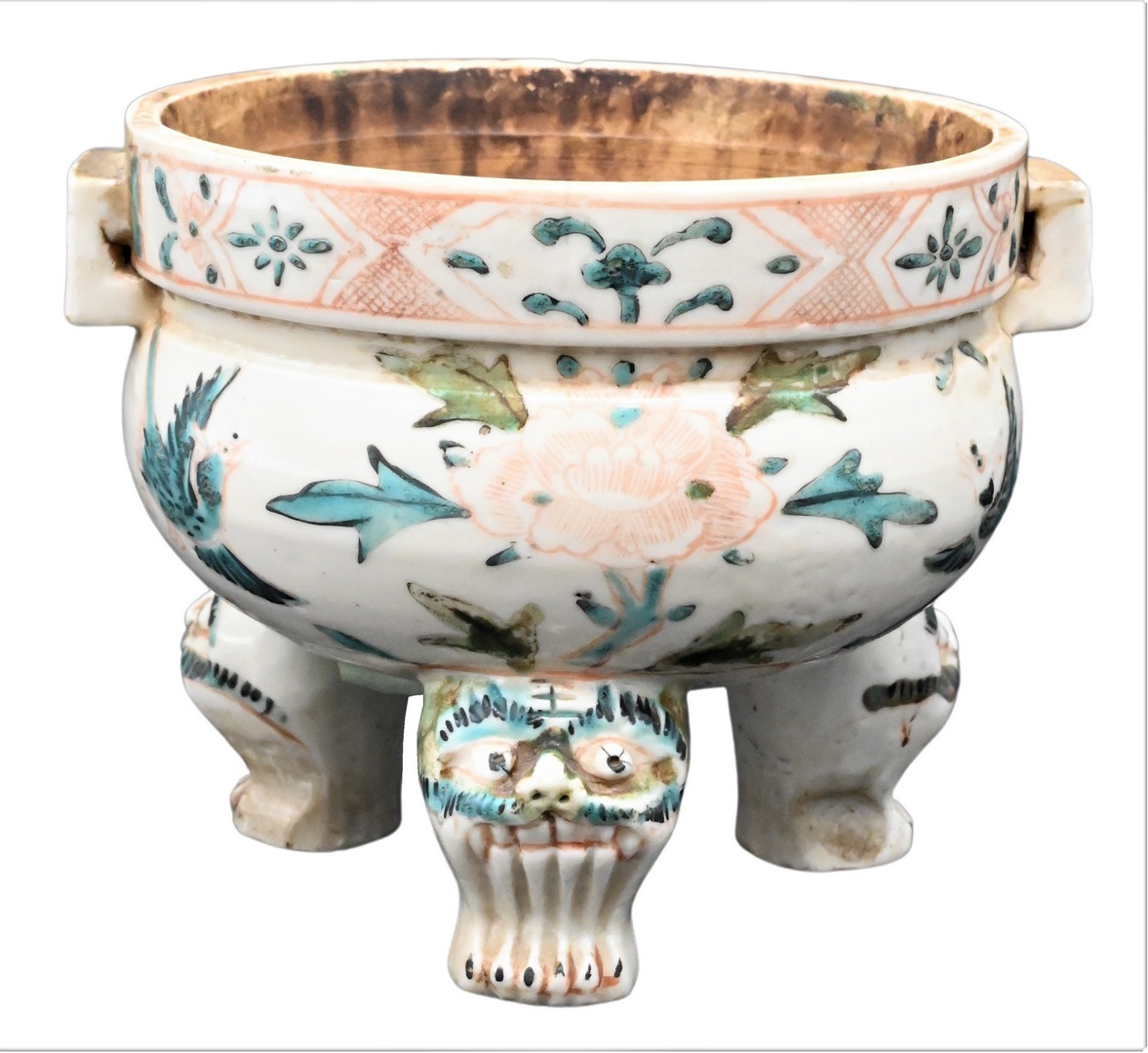 Small Japanese Arita Porcelain Tripod Censer, Edo period (1603 – 1868), possibly Kakiemon, zoomorphic legs support a body decorated with chrysanthemum flowers and leaves, height 5 inches. Provenance: Estate of James Dana English of New Haven to benefit the New Haven CT Museum.