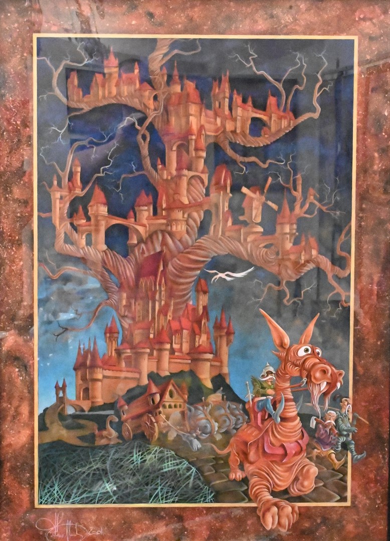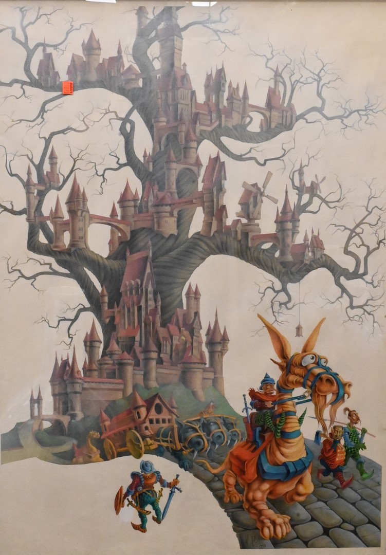 Sergey Poyarkov (b. 1965, Ukrainian), mixed media on paper, “Treehouse”, signed and dated lower left “Sergey Poyarkov, 2001″, 39 1/2″ x 28 1/2”. Sergey Poyarkov (b. 1965, Ukrainian), mixed media on paper, “Treehouse”, signed and dated lower left “Sergey Poyarkov, 2001″, 39 1/2″ x 28 1/2”, Provenance: Estate of Peter Tillou, Litchfield, Connecticut