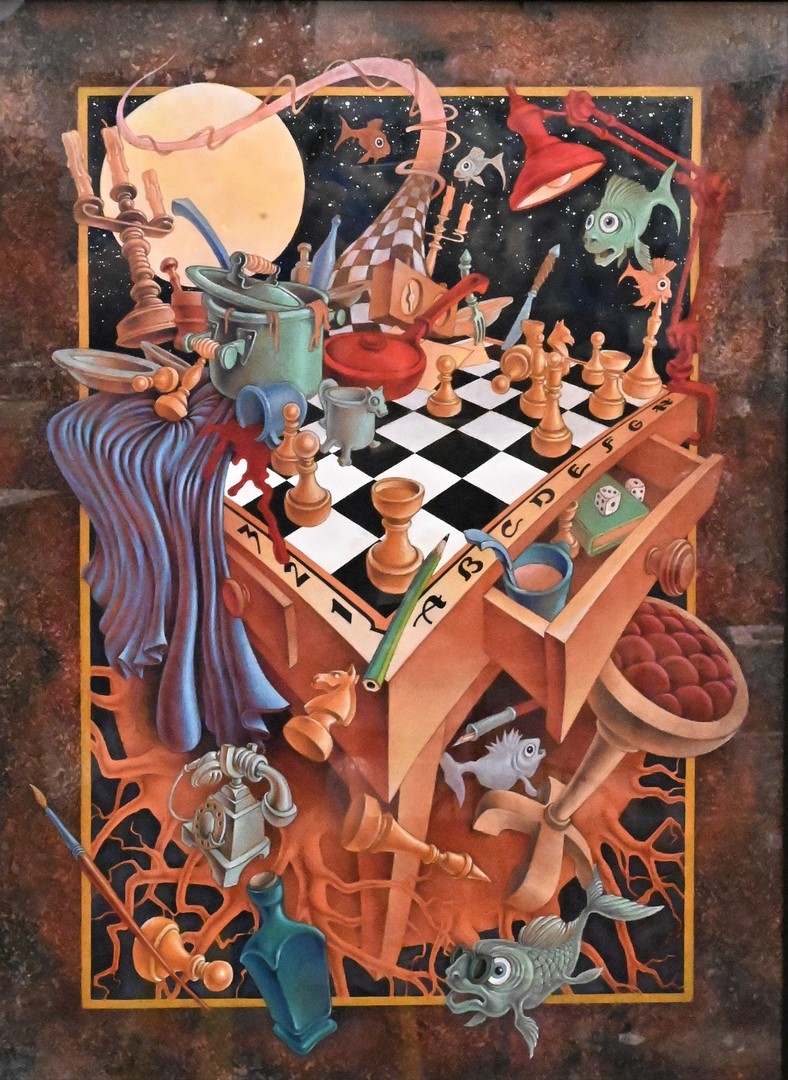 Sergey Poyarkov (b. 1965, Ukrainian), mixed media on paper, “Chess or Supper with candle Lights Beating a Game of Oness”, signed and dated lower right “Sergey Poyarkov, 1997″, 30″ x 22”. Provenance: Estate of Peter Tillou, Litchfield, Connecticut.