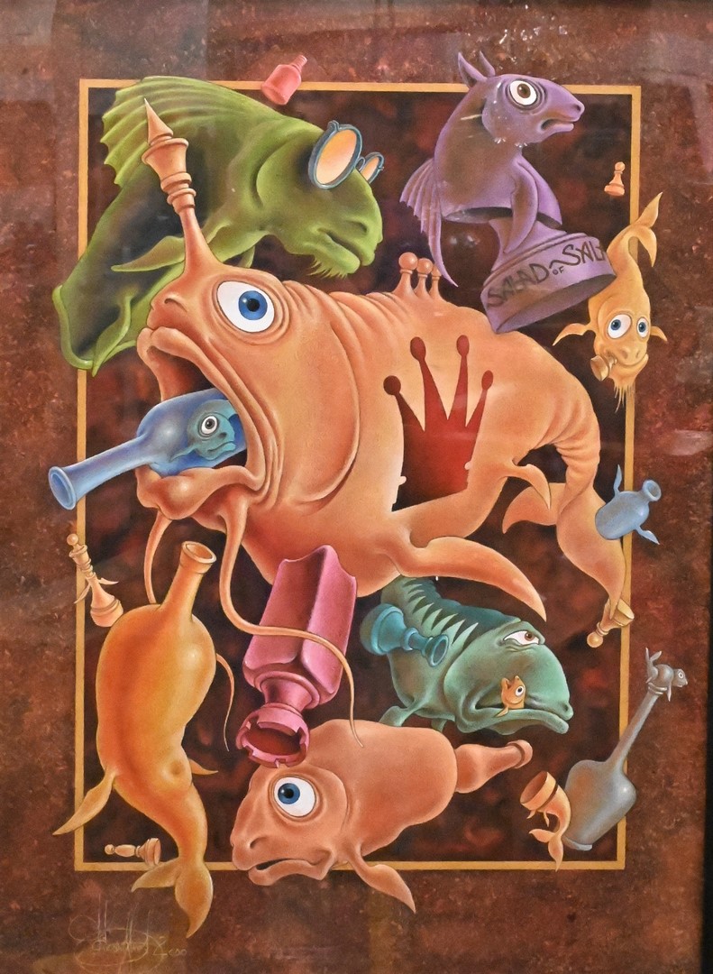 Sergey Poyarkov (b. 1965, Ukrainian), mixed media on paper, “Salad of Salads”, signed and dated “Sergey Poyarkov, 2001″, 30″ x 20”. Provenance: Estate of Peter Tillou, Litchfield, Connecticut.