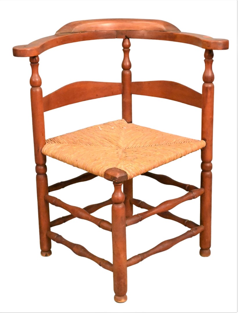 Queen Anne Corner Chair, having yoke back, rush seat on turned legs, seat height 16 inches, chair height 31 inches, Provenance: Estate of Cyril H. Moore Jr, Kent, Connecticut.