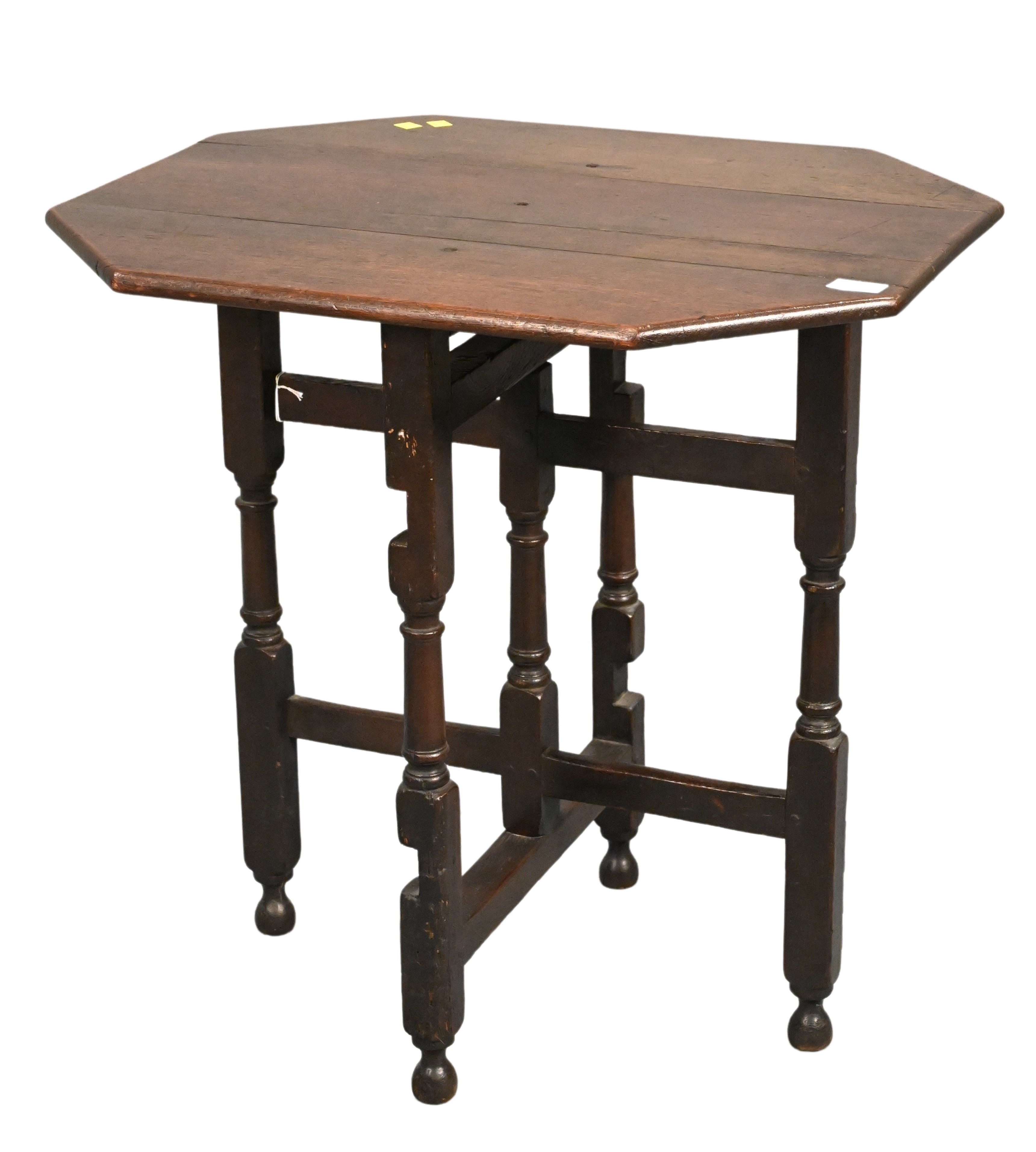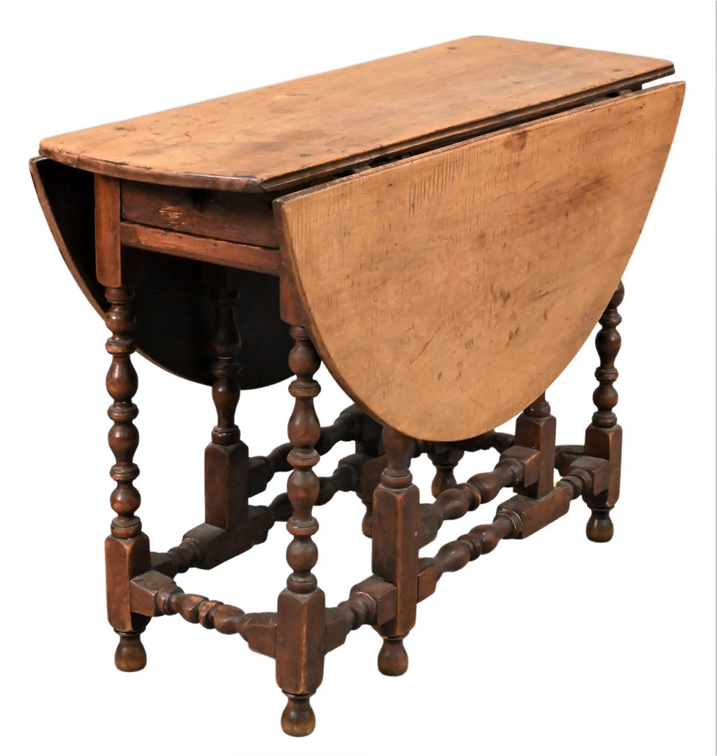 William & Mary Gateleg Table, having oval drop leaves, align with drawer on turned legs, 17th century, (restored), height 28 1/8 inches, top 40 1/2″ x 45″. Provenance: Estate of Peter Tillou, Litchfield, Connecticut.