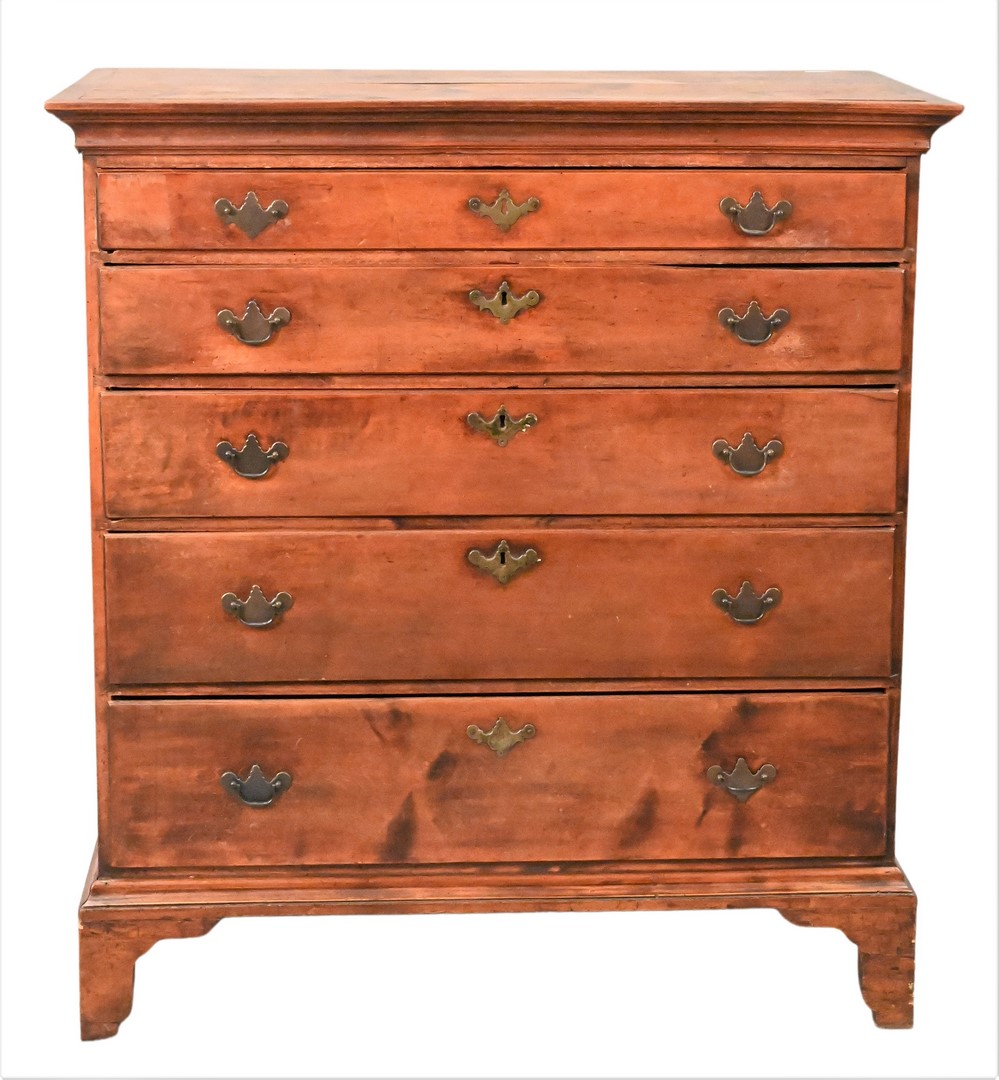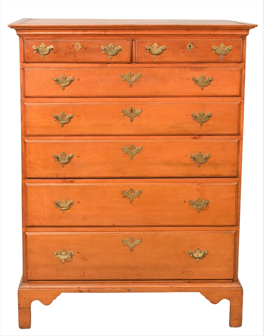 Chippendale Cherry Tall Chest, having large cornice molded top over two short drawers over five drawers, on high bracket feet, height 49 1/4 inches, width 35 inches, top 19 1/2″ x 37 3/4″.