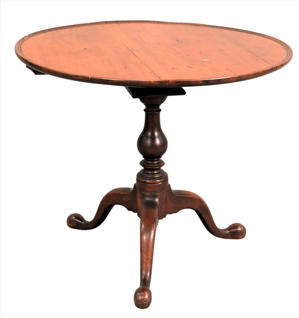 Tip and Turn Table, having dished top, on turned shaft on tripod base, 18th century, height 28 1/2 inches, top 34 1/4″ x 34 3/4″. Provenance: Estate of Peter Tillou, Litchfield, Connecticut.