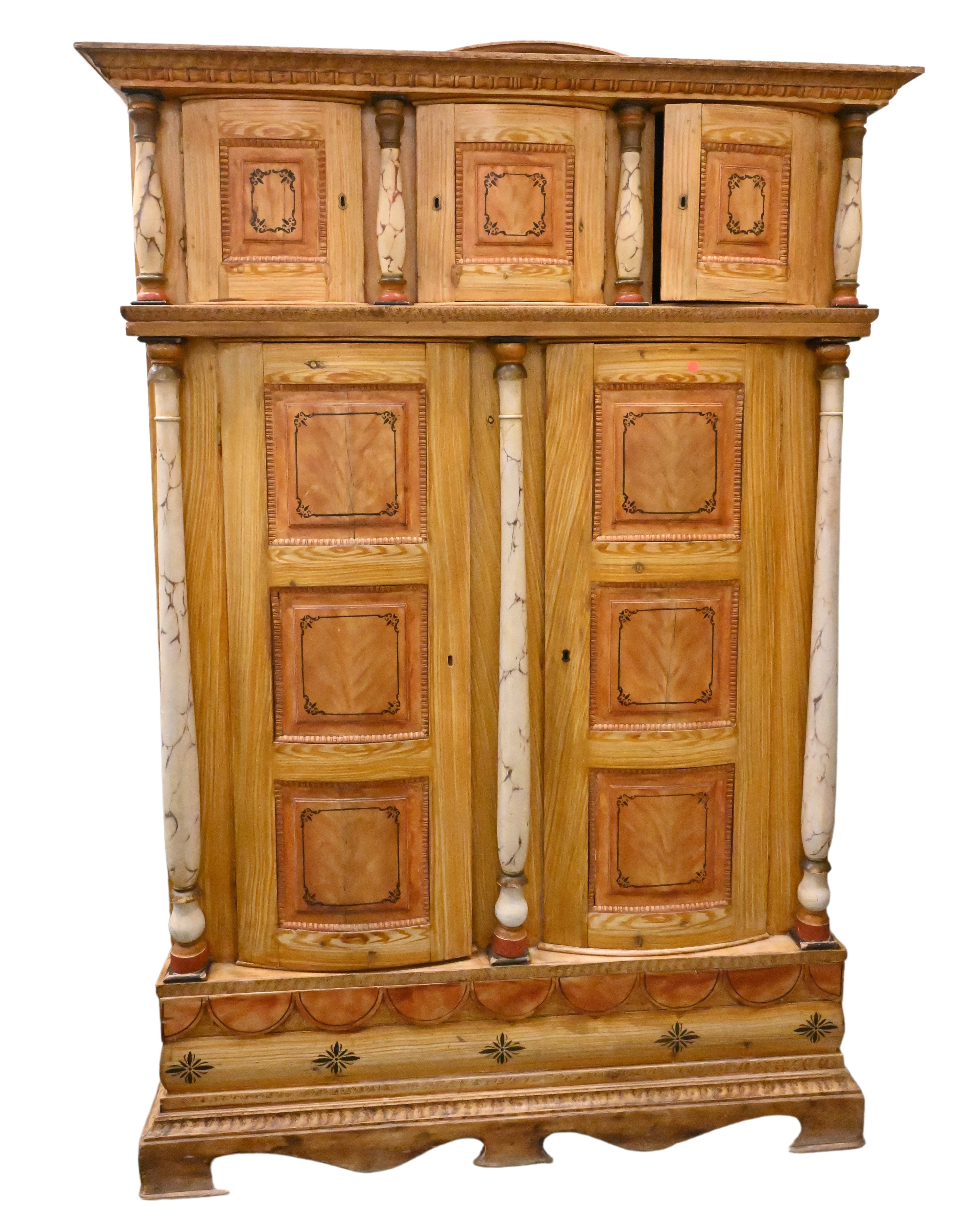 Continental Five Door Cabinet, in grain paint having four faux marble painted columns, probably 19th century, height 82 inches, width 57 inches, depth 24 inches, Provenance: Estate of Peter Tillou, Litchfield, Connecticut.