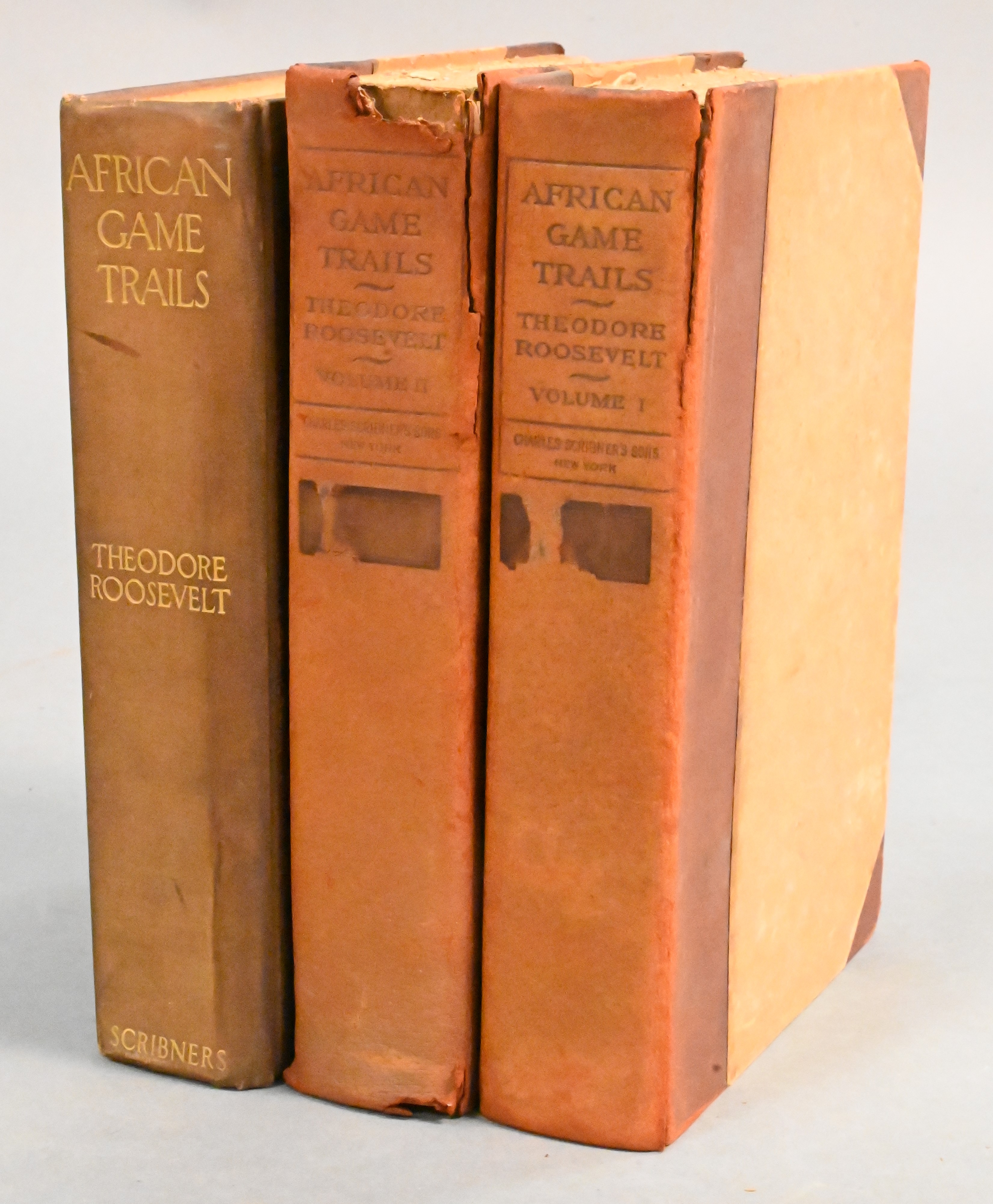 Volumes 1 and 2 of Theodore Roosevelt’s “African Game Trials”, signed limited first edition copy, numbered 226/500, signed by Roosevelt on the limitation page in the first volume, published by Charles Scribner’s Sons in New York in 1910, along with an additional copy of African Game Trials published by Scribners, Provenance: Estate of Cyril H. Moore Jr, Kent, Connecticut.