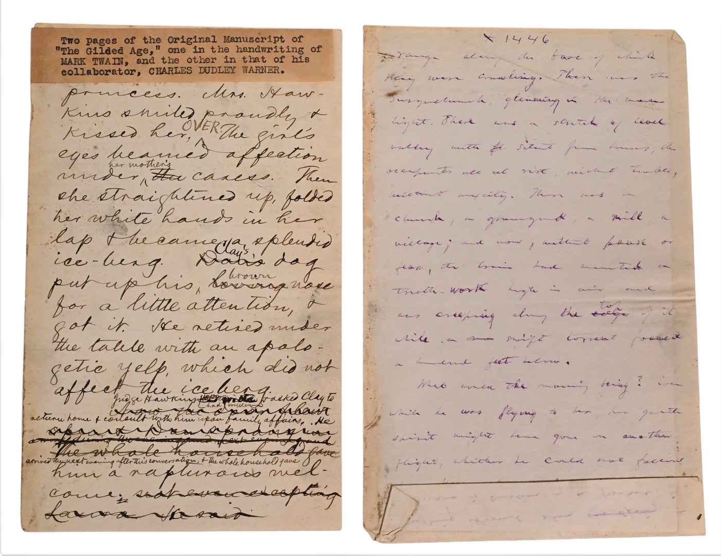 Mark Twain “The Gilded Age”, to include two pages of the original manuscript, one double-sided in the handwriting of Mark Twain and the other in that of his collaborator Charles Dudley Warner.