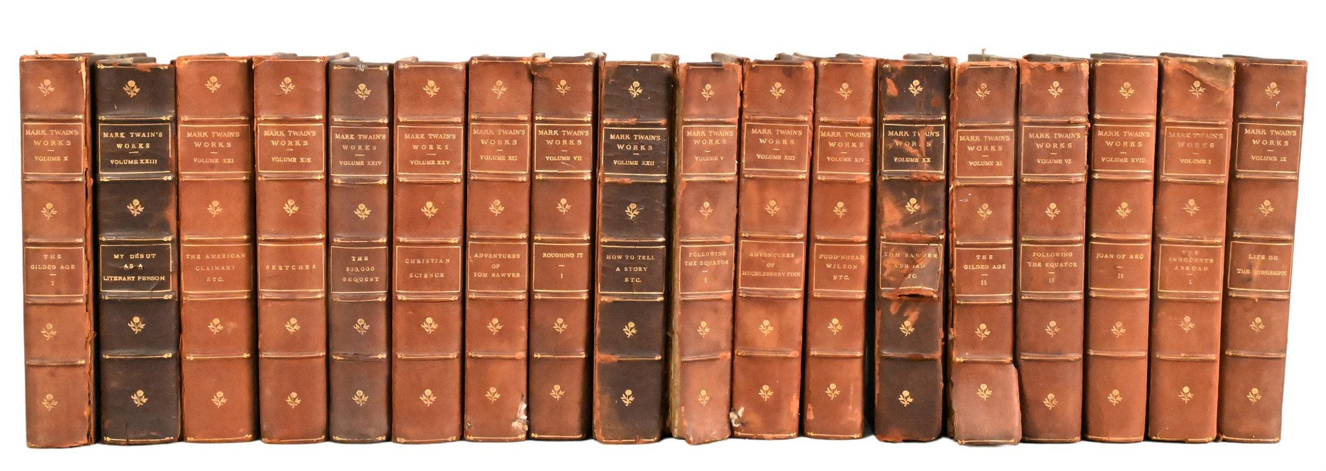 18 Volume Limited Autographed Edition Leatherbound Book Set of Mark Twain Works, published in 1899, with the first volume having Samuel Clemens signature.