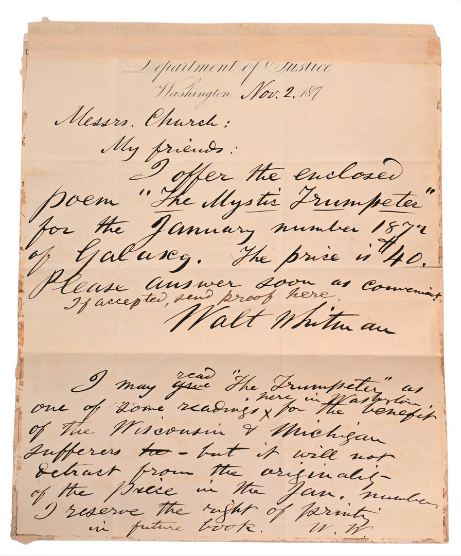 Walt Whitman Letter, on Department of Justice letterhead, Washington, November 2, 187_, to Wm. C. Church, askign for $40 for poem Mystic Trumpeter, but reserving the right to print, not unlike letter in Walt Whitman Archives.