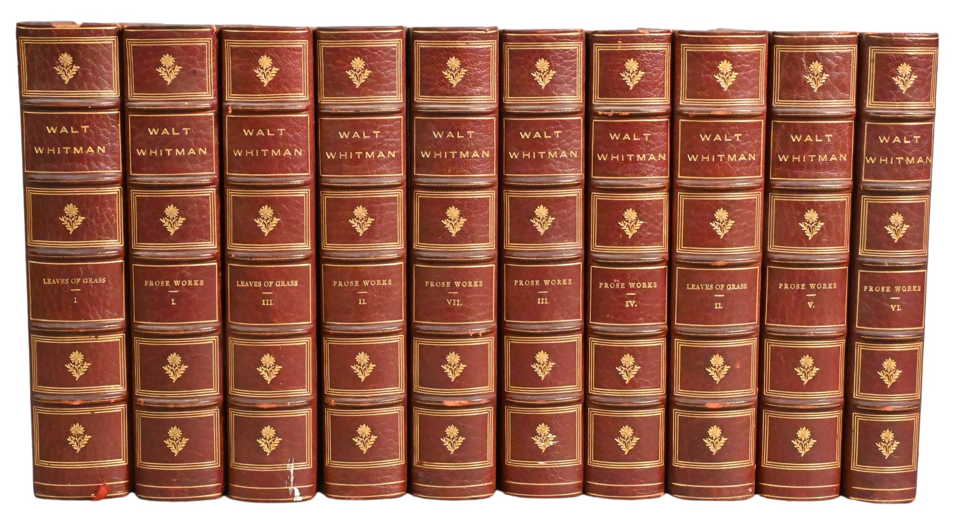 10 Volume “Paumonok Edition” Leatherband Book Set of the “Complete Works of Walt Whitmans Works”, number 206/300, with the first volume having Whitman’s signature, published in 1902, Provenance: Estate of Cyril H. Moore Jr, Kent, Connecticut.