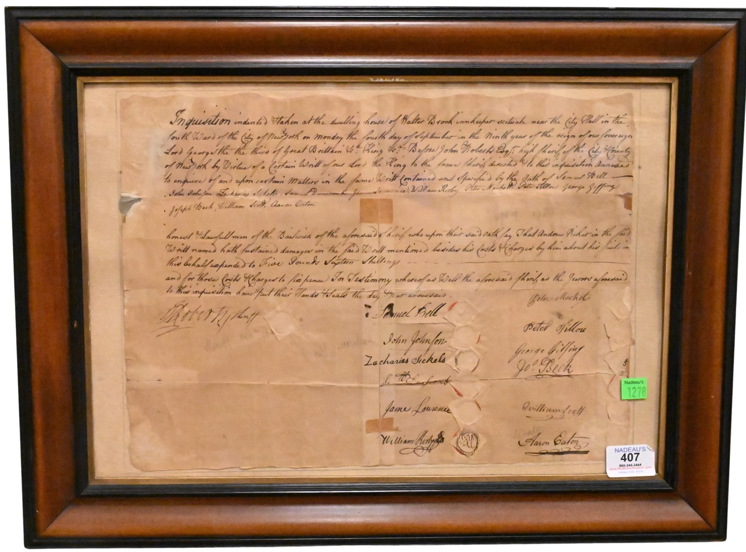 Early Document, reading “Inquisition indented, taken at the dwelling house of Walter Brook, innkeeper, Scituate near City Hall in the fourth ward of the city of New York, Sept. in 9th year of the reign of Lord George the III”, 12 signatures to include Samuel Bell, John Johnson, James Lawrence, etc., framed, sheet size 11 1/4″ x 15″. Provenance: Estate of Peter Tillou, Litchfield, Connecticut.