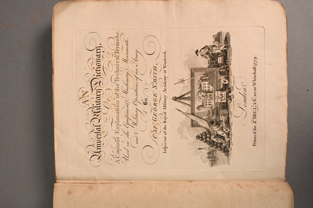 Universal Military Dictionary by Captain George Smith, London, printed for J. Millan near Whitehall, 1779, having several pullouts in back of book, 9 1/2″ x 11 3/4″. Provenance: Estate of Peter Tillou, Litchfield, Connecticut.