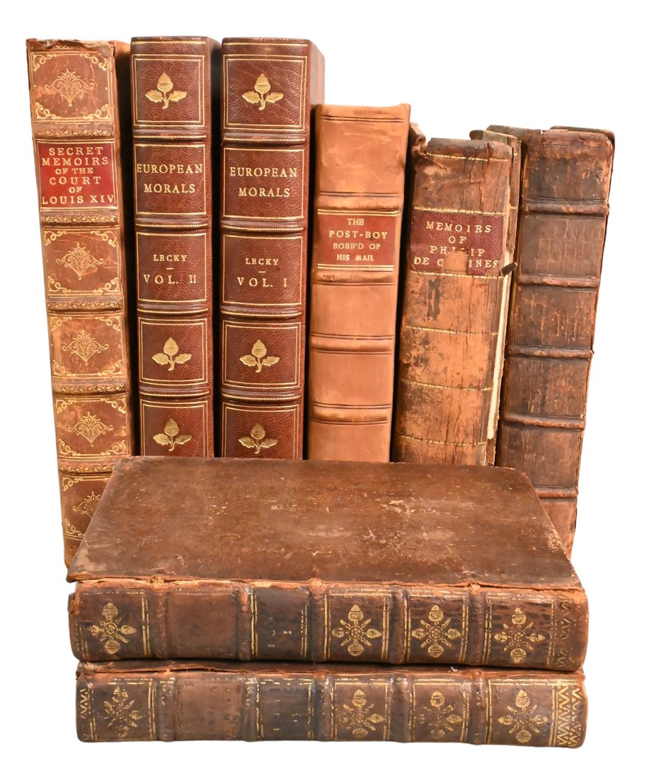 Eight Leather Bound Books, to include “Secret Memoirs of the Court of Louis XIV”, published in 1824; volumes 1 and 2 of “History of European Morals”, by Lecky; two volumes of “Memoires Du Cardinal De Retz”, published in 1731; “Arcana Gallica” or “The Secret History of France Published in 1714”, “The Memoirs of Philip de Comines Lord of Argenton”, published in 1674; along with “The Post Boy Robb’d of His Mail”, second edition, published in 1706, Provenance: Estate of Cyril H. Moore Jr, Kent, Connecticut.