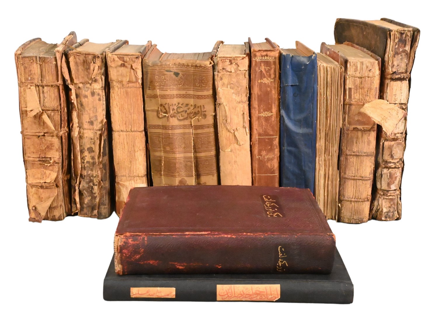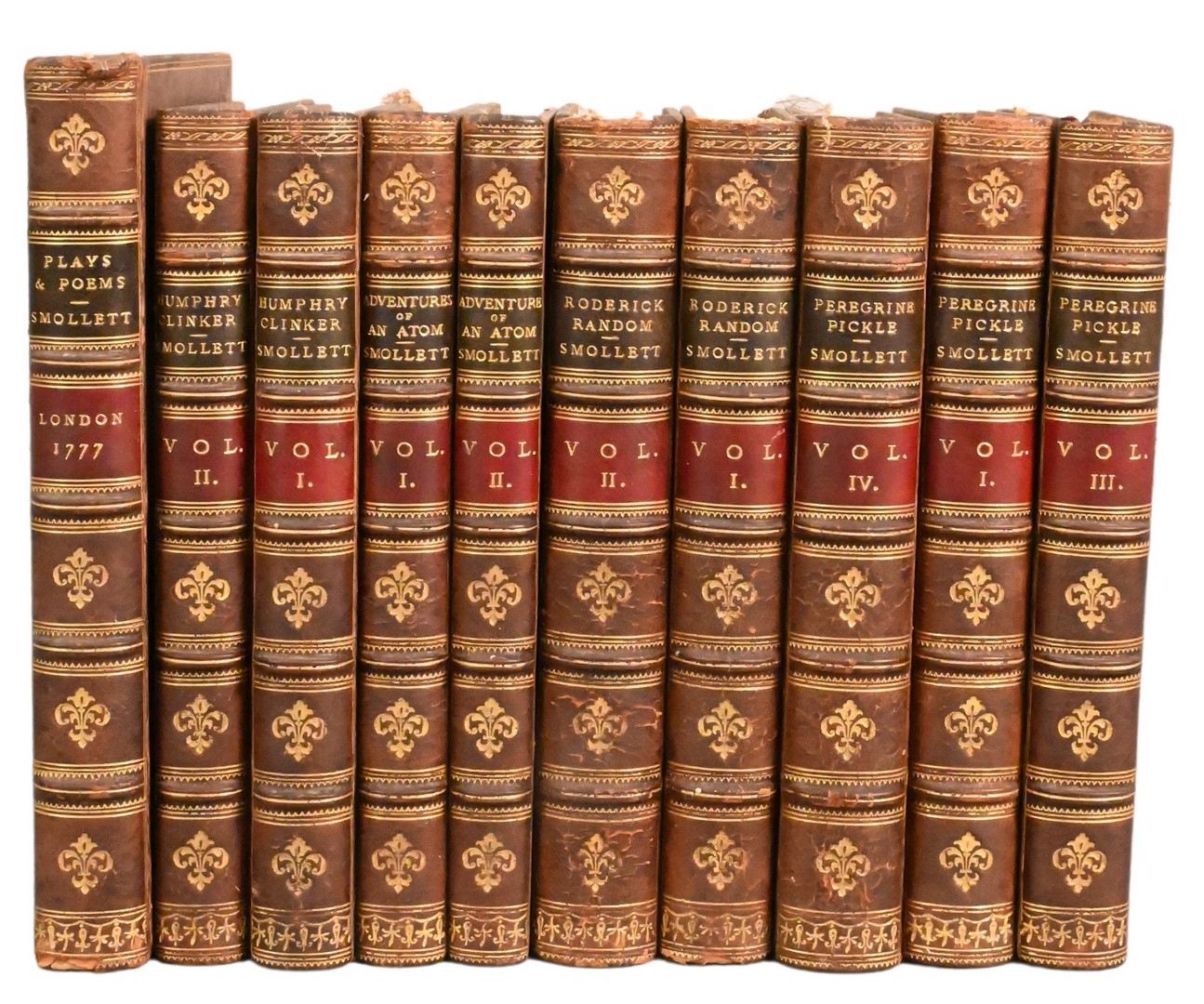 10 Leather Bound Books, to include volumes 1 and 2 of “The Expedition of Humphry Clinker”, published in 1771, authored by Roderick Random, volumes 1 and 2 of “The History and Adventures of an Atom”, published in 1769 and authored by Smollett, volumes 1 and 2 of “The Adventures of Roderick Random”, published in 1748 and authored by Smollett, volumes 1, 3 and 4 of “The Adventures of Peregrine Pickle”, authored by Smollett, align with one volume of “Plays and Poems”, published in 1777 and authored by Smollett, Provenance: Estate of Cyril H. Moore Jr, Kent, Connecticut.
